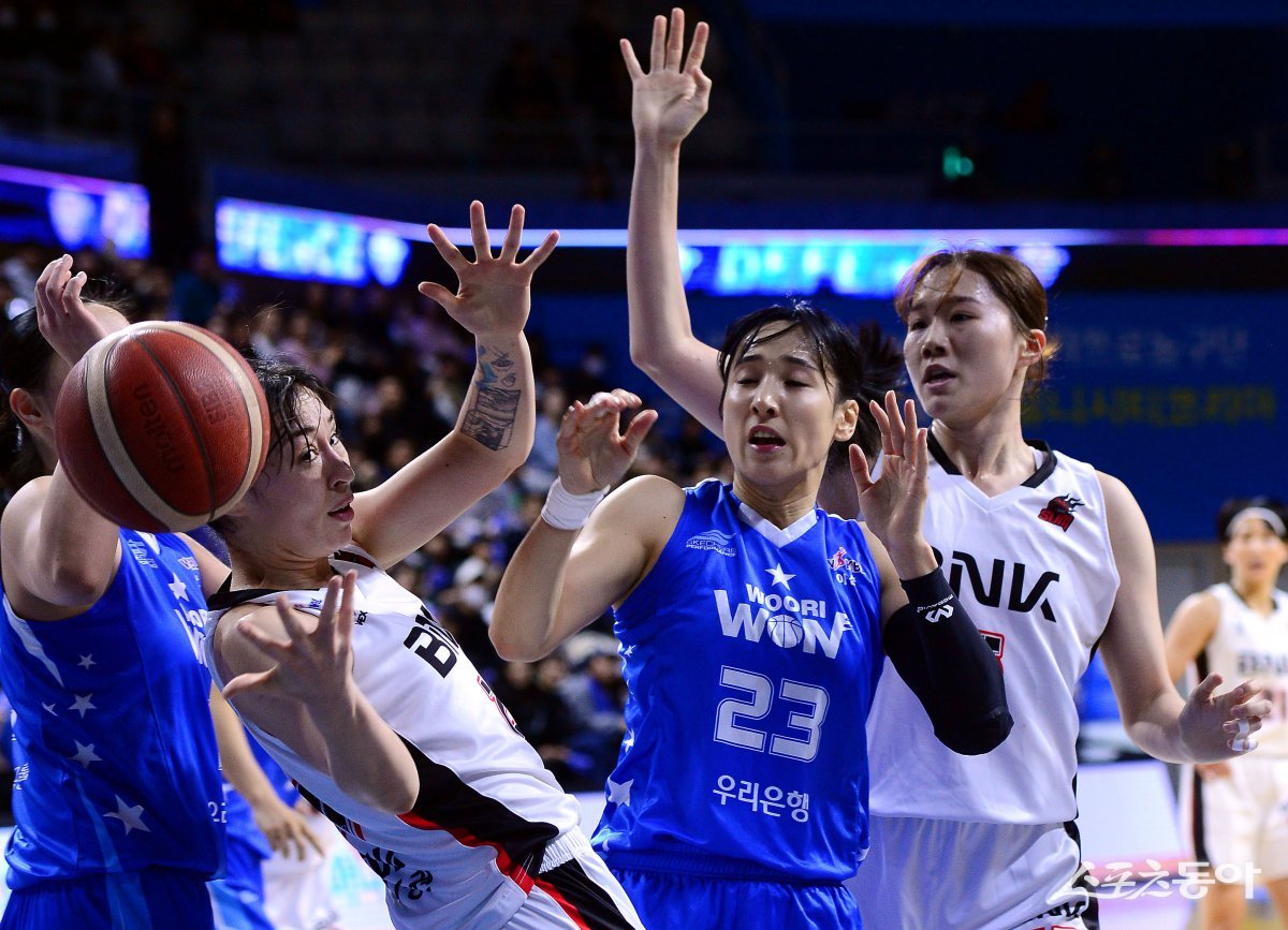 12일 충남 아산이순신체육관에서 열린 ‘하나은행 2024-2025 여자프로농구’ 아산 우리은행과 부산 BNK썸의 경기에서 BNK썸 김소니아가 리바운드를 시도하고 있다. 아산 | 김민성 기자 marineboy@donga.com