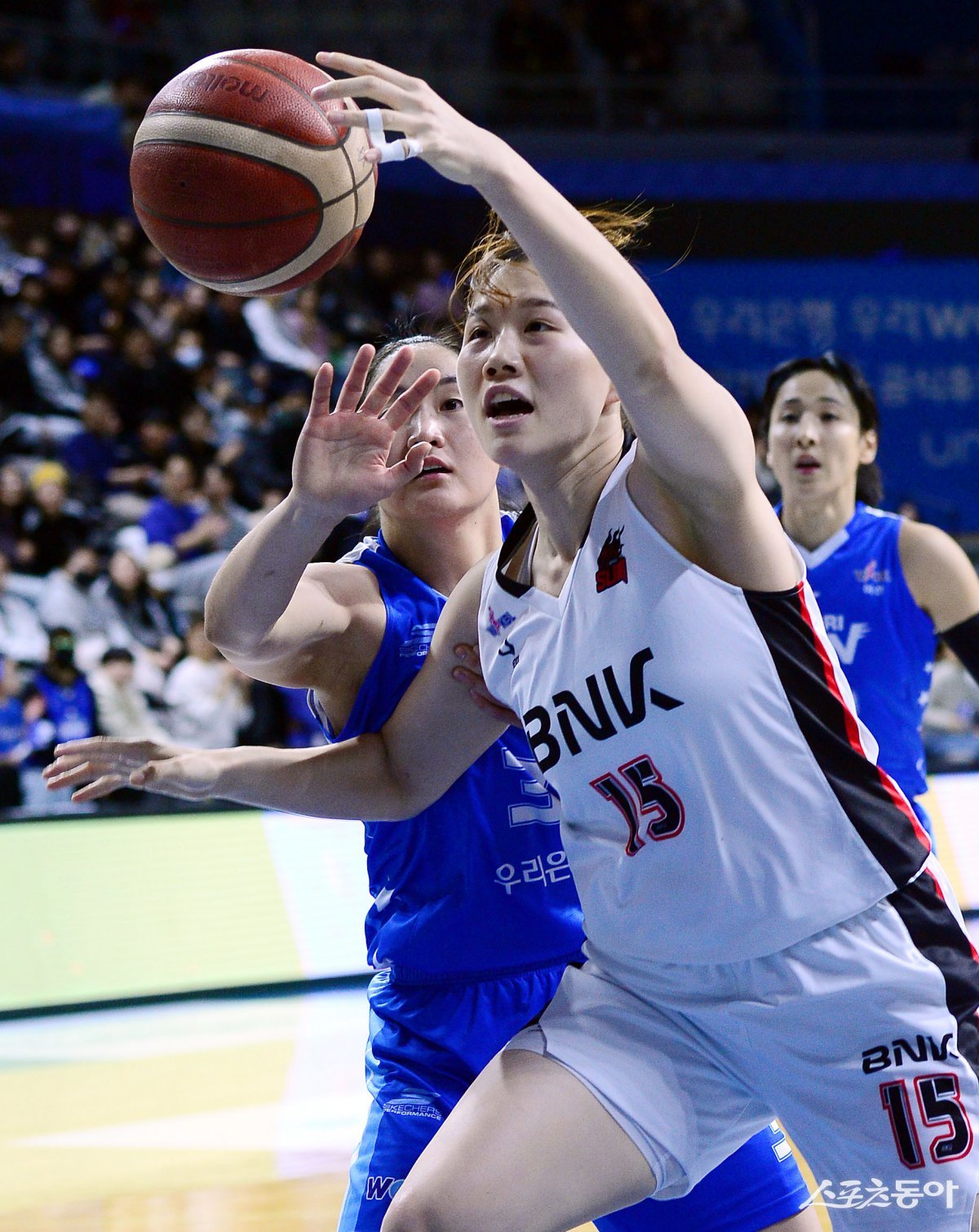 12일 충남 아산이순신체육관에서 열린 ‘하나은행 2024-2025 여자프로농구’ 아산 우리은행과 부산 BNK썸의 경기에서 BNK썸 박성진이 우리은행 한엄지와 볼 다툼을 벌이고 있다. 아산 | 김민성 기자 marineboy@donga.com