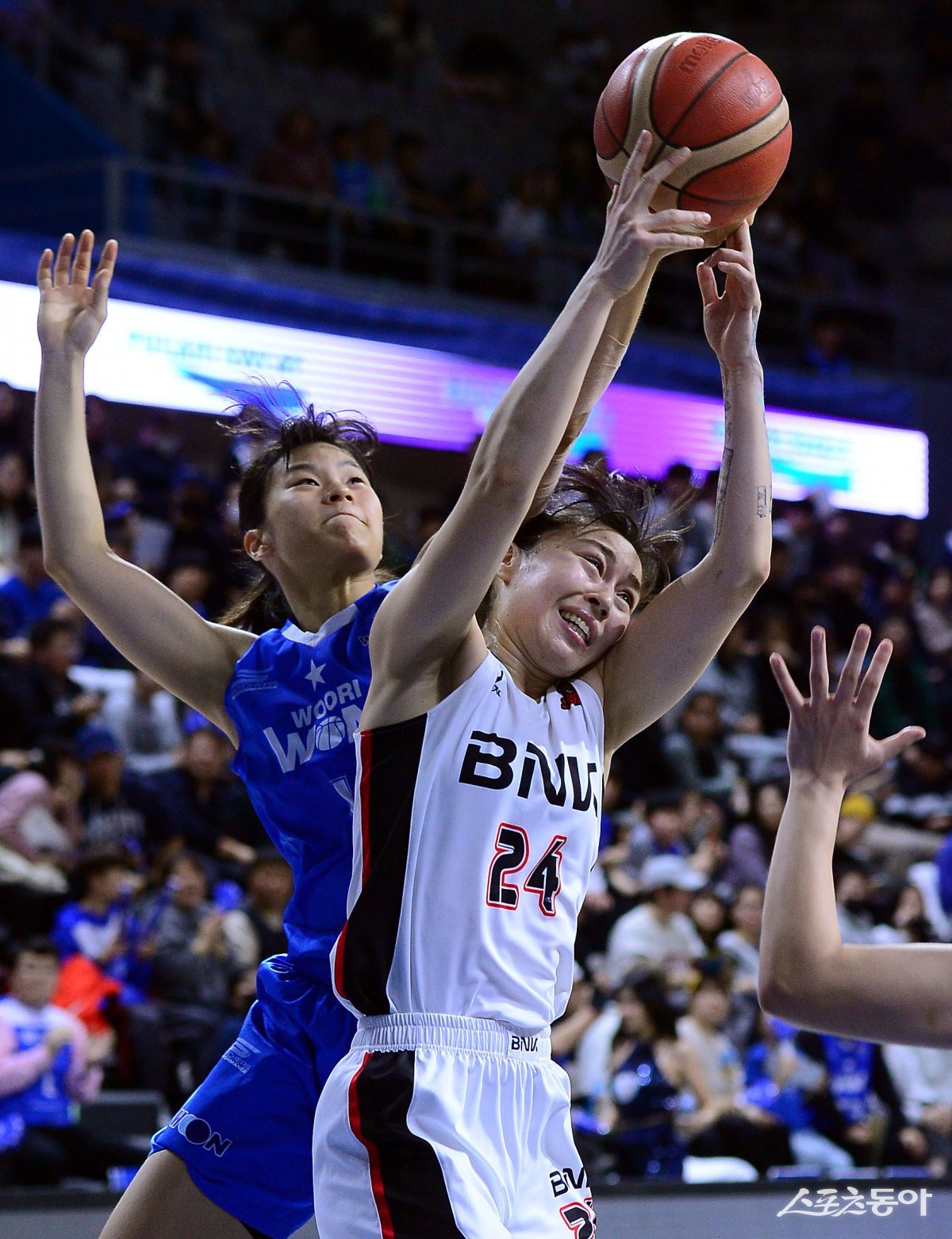 12일 충남 아산이순신체육관에서 열린 ‘하나은행 2024-2025 여자프로농구’ 아산 우리은행과 부산 BNK썸의 경기에서 BNK썸 김소니아와 우리은행 변하정이 리바운드를 다투고 있다. 아산 | 김민성 기자 marineboy@donga.com