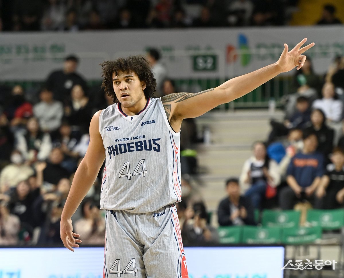 12일 원주종합체육관에서 열린 ‘2024-2025 프로농구’ DB와 현대모비스 경기에서 현대모비스 프림이 득점에 성공한 후 기뻐하고 있다. 원주|김종원 기자 won@donga.com