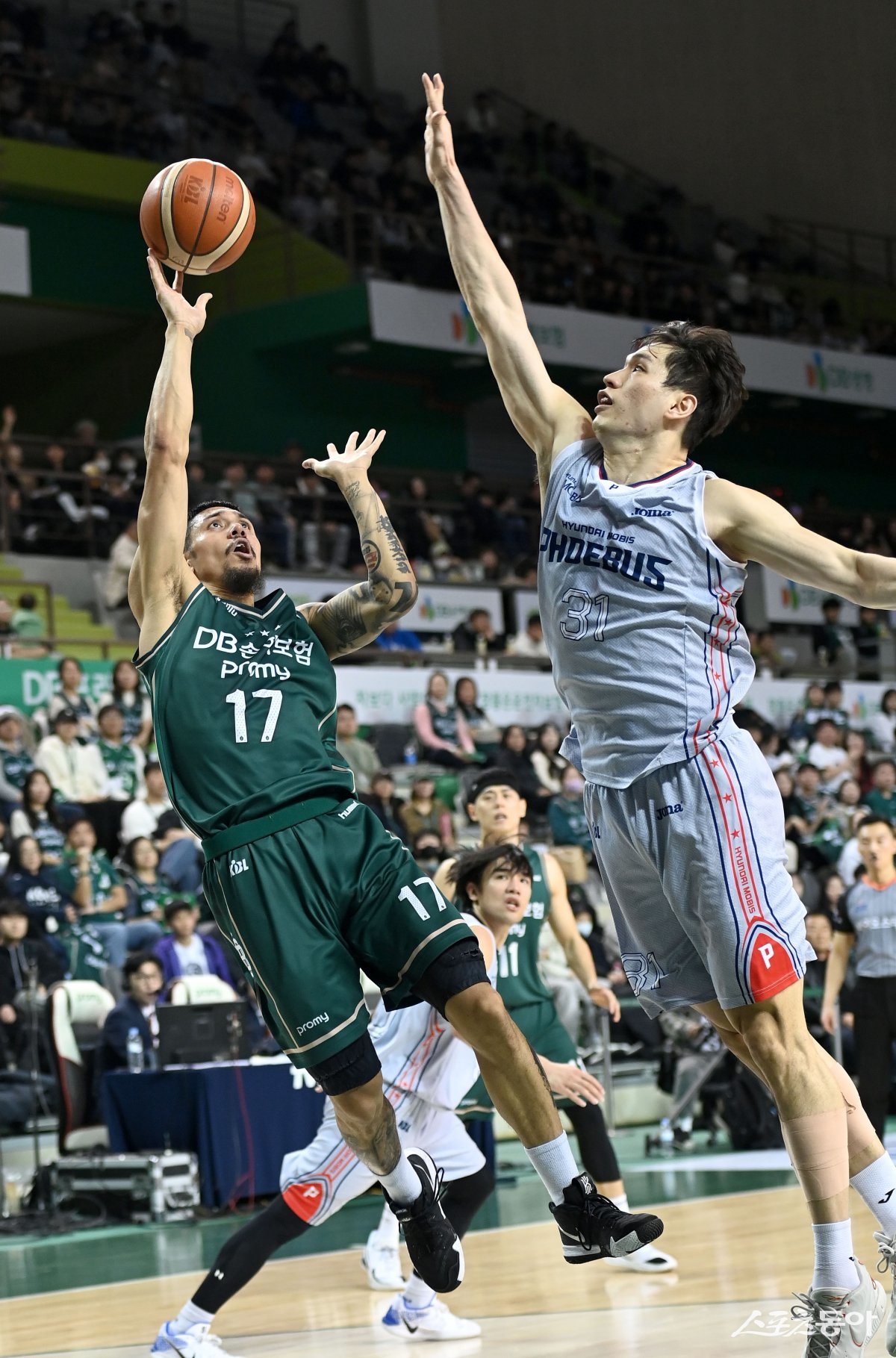 12일 원주종합체육관에서 열린 ‘2024-2025 프로농구’ DB와 현대모비스 경기에서 DB 알바노가 현대모비스의 수비를 뚫고 골밑 슛을 하고 있다. 원주|김종원 기자 won@donga.com