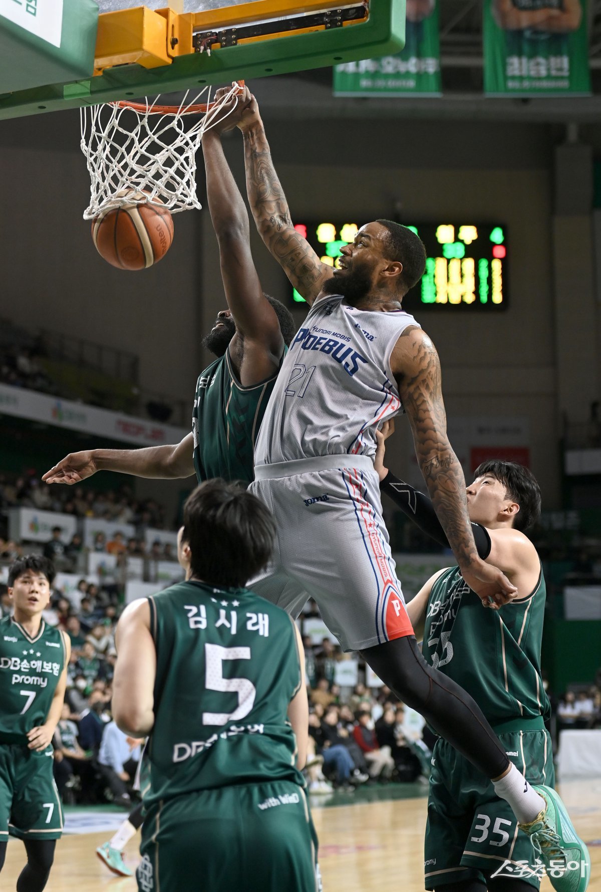 12일 원주종합체육관에서 열린 ‘2024-2025 프로농구’ DB와 현대모비스 경기에서 현대모비스 숀롱이 덩크슛을 성공시키고 있다. 원주|김종원 기자 won@donga.com