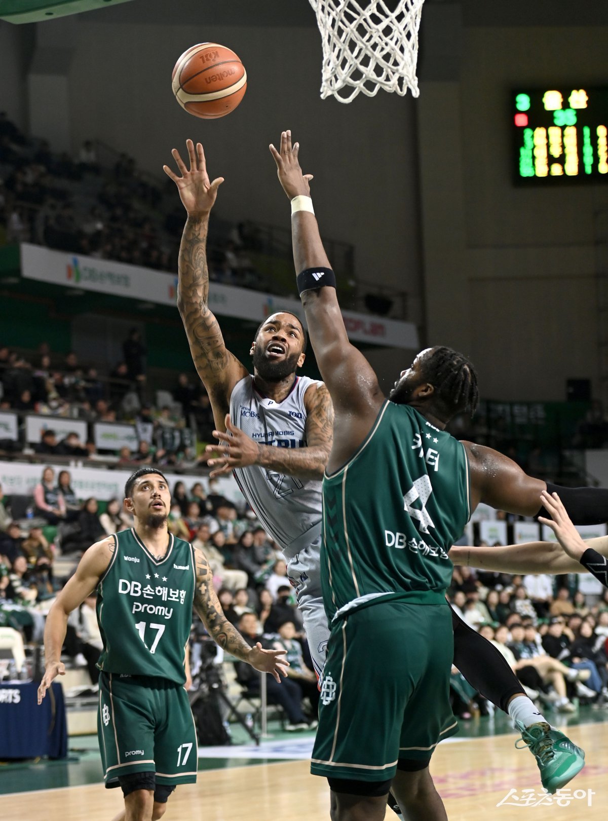 12일 원주종합체육관에서 열린 ‘2024-2025 프로농구’ DB와 현대모비스 경기에서 현대모비스 숀롱이 DB 수비를 뚫고 골밑 슛을 하고 있다. 원주|김종원 기자 won@donga.com