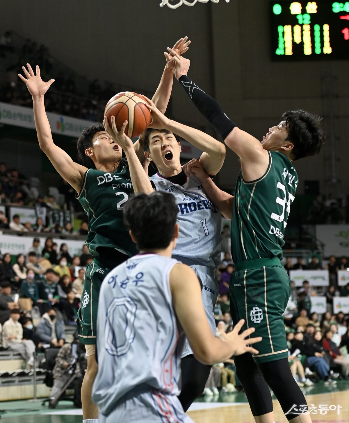 12일 원주종합체육관에서 열린 ‘2024-2025 프로농구’ DB와 현대모비스 경기에서 현대모비스 김준일이 DB 수비를 뚫고 골밑을 공격하고 있다. 원주|김종원 기자 won@donga.com