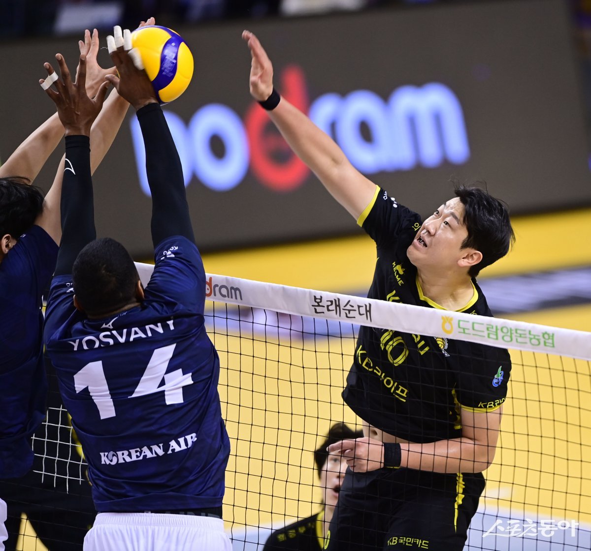 12일 경기 의정부 경민대학교 체육관에서 열린 ‘도드람 2024-2025 V리그’ 남자부 의정부 KB손해보험과 인천 대한항공의 경기에서 KB손해보험 나경복이 대한항공 블로커 앞에서 스파이크를 하고 있다. 의정부 | 주현희 기자 teth1147@donga.com
