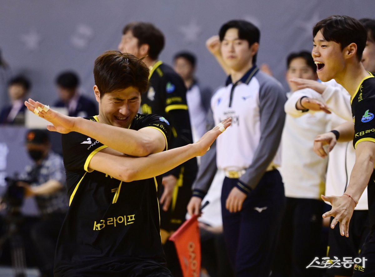 12일 경기 의정부 경민대학교 체육관에서 열린 ‘도드람 2024-2025 V리그’ 남자부 의정부 KB손해보험과 인천 대한항공의 경기에서 블로킹 득점에 성공한 KB손해보험 박상하가 세리머니를 하고 있다. 의정부 | 주현희 기자 teth1147@donga.com