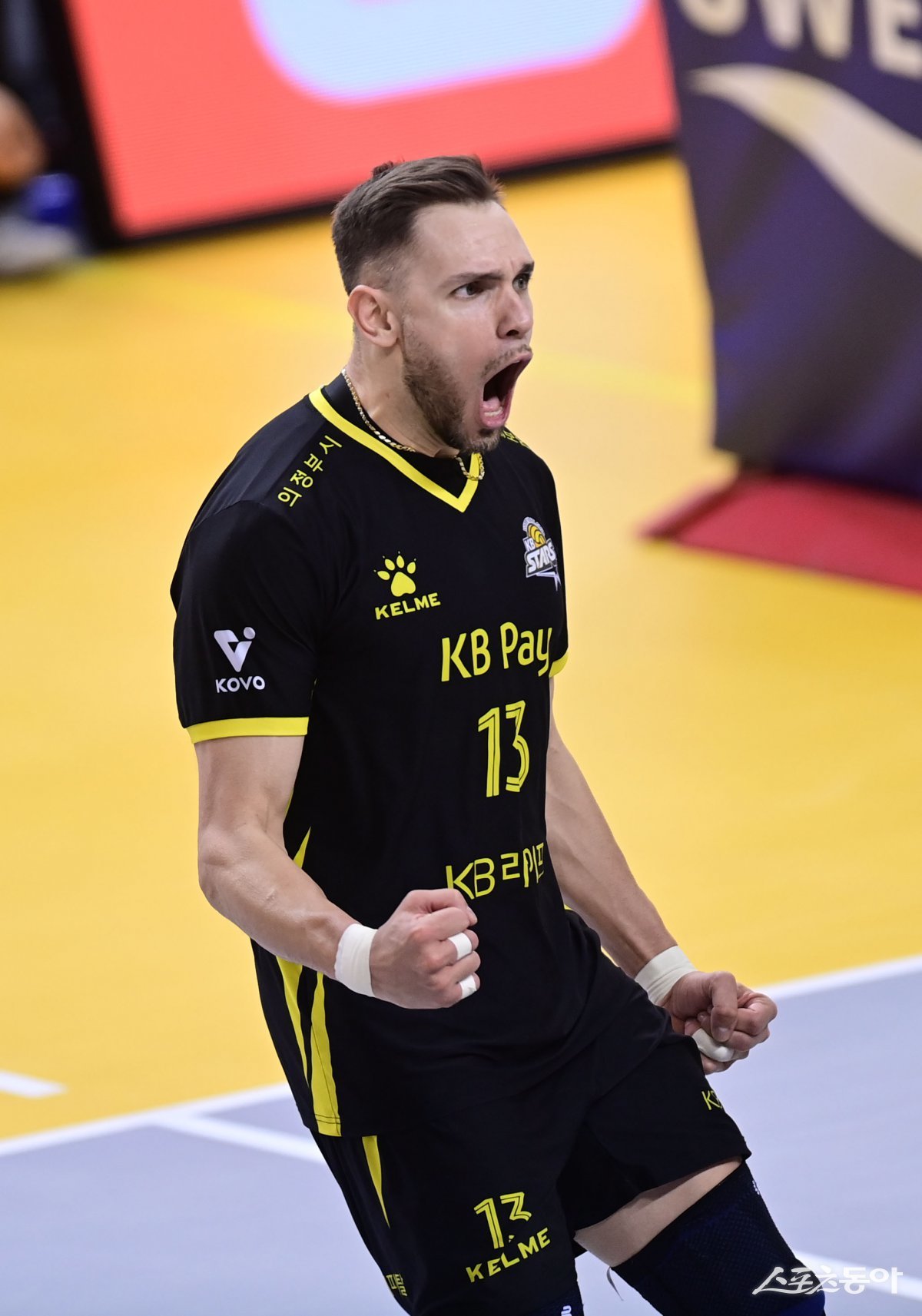 12일 경기 의정부 경민대학교 체육관에서 열린 ‘도드람 2024-2025 V리그’ 남자부 의정부 KB손해보험과 인천 대한항공의 경기에서 득점에 성공한 KB손해보험 비예나가 포효하고 있다. 의정부 | 주현희 기자 teth1147@donga.com