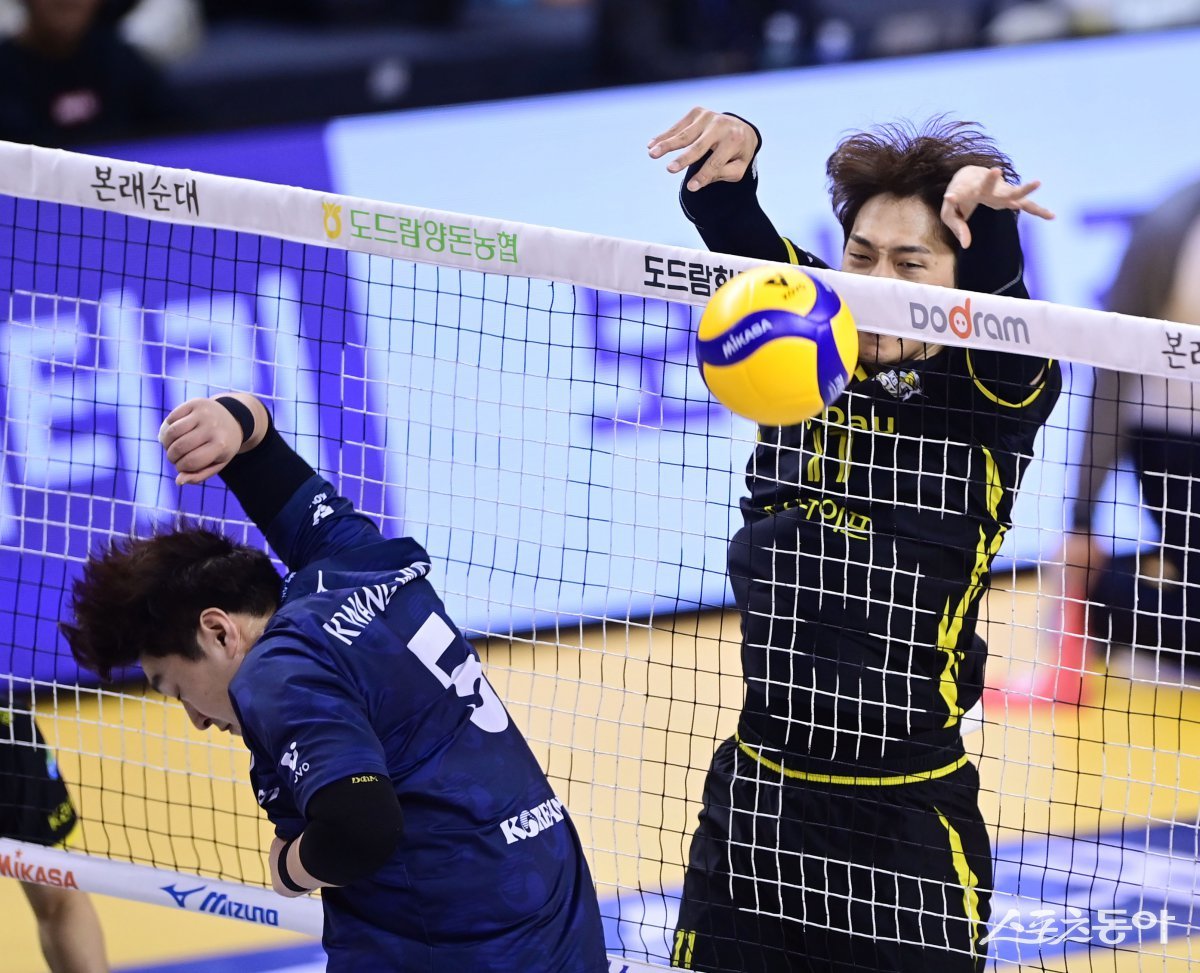 12일 경기 의정부 경민대학교 체육관에서 열린 ‘도드람 2024-2025 V리그’ 남자부 의정부 KB손해보험과 인천 대한항공의 경기에서 KB손해보험 차영석이 대한항공 리시브 실책에 밀어넣기 공격을 하고 있다. 의정부 | 주현희 기자 teth1147@donga.com