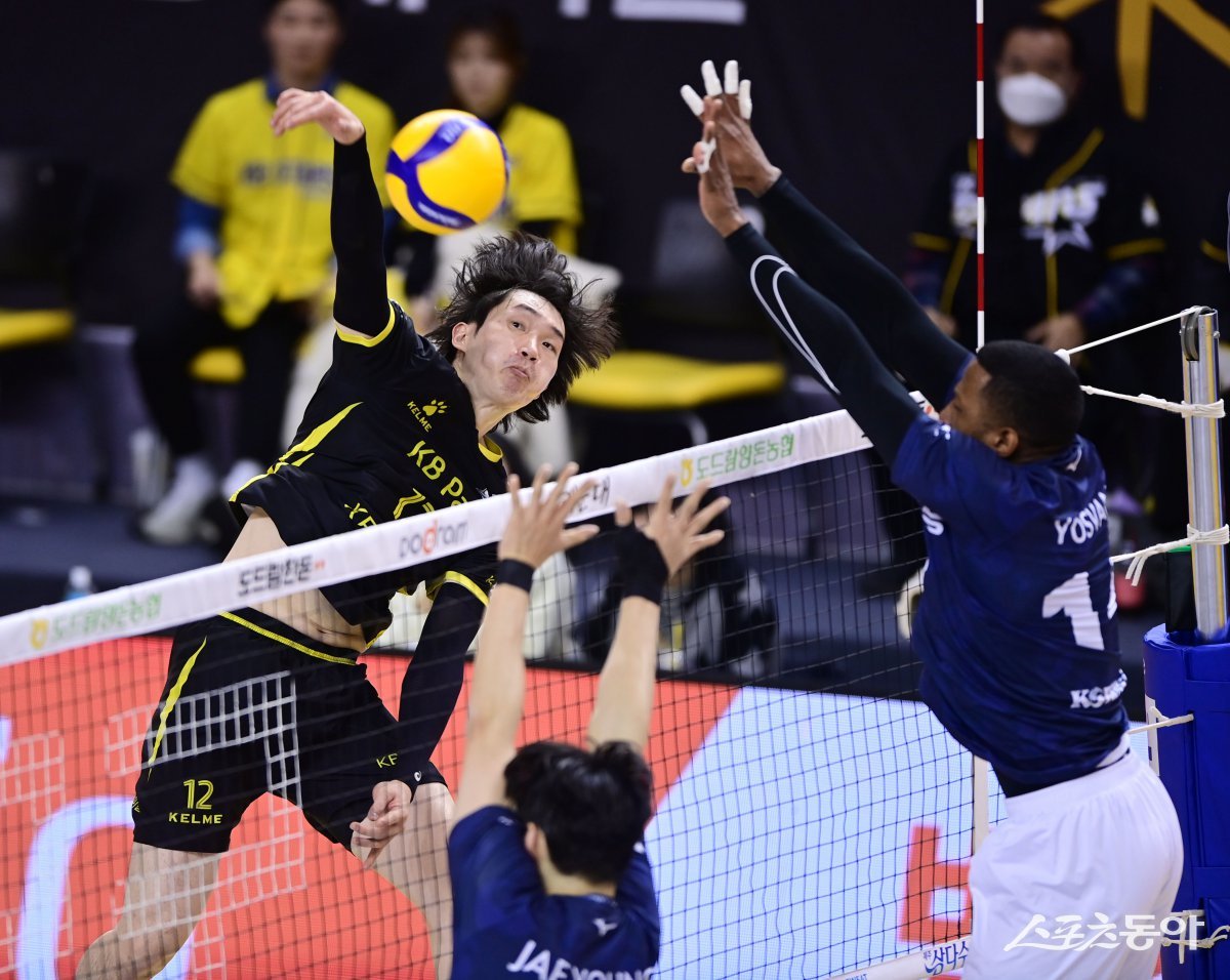12일 경기 의정부 경민대학교 체육관에서 열린 ‘도드람 2024-2025 V리그’ 남자부 의정부 KB손해보험과 인천 대한항공의 경기에서 KB손해보험 황경민이 대한항공 블로커 앞에서 스파이크를 하고 있다. 의정부 | 주현희 기자 teth1147@donga.com
