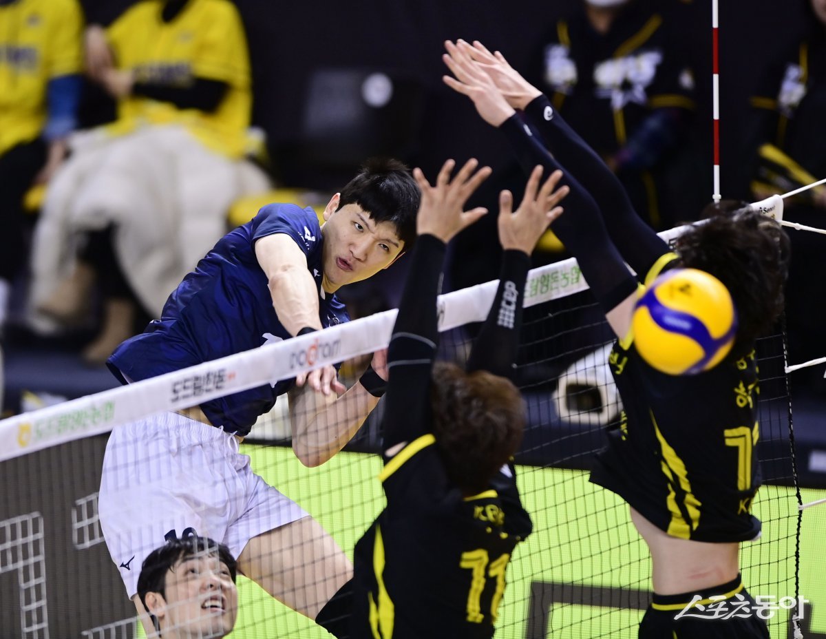 12일 경기 의정부 경민대학교 체육관에서 열린 ‘도드람 2024-2025 V리그’ 남자부 의정부 KB손해보험과 인천 대한항공의 경기에서 대한항공 정지석이 KB손해보험 블로커 앞에서 스파이크를 하고 있다. 의정부 | 주현희 기자 teth1147@donga.com