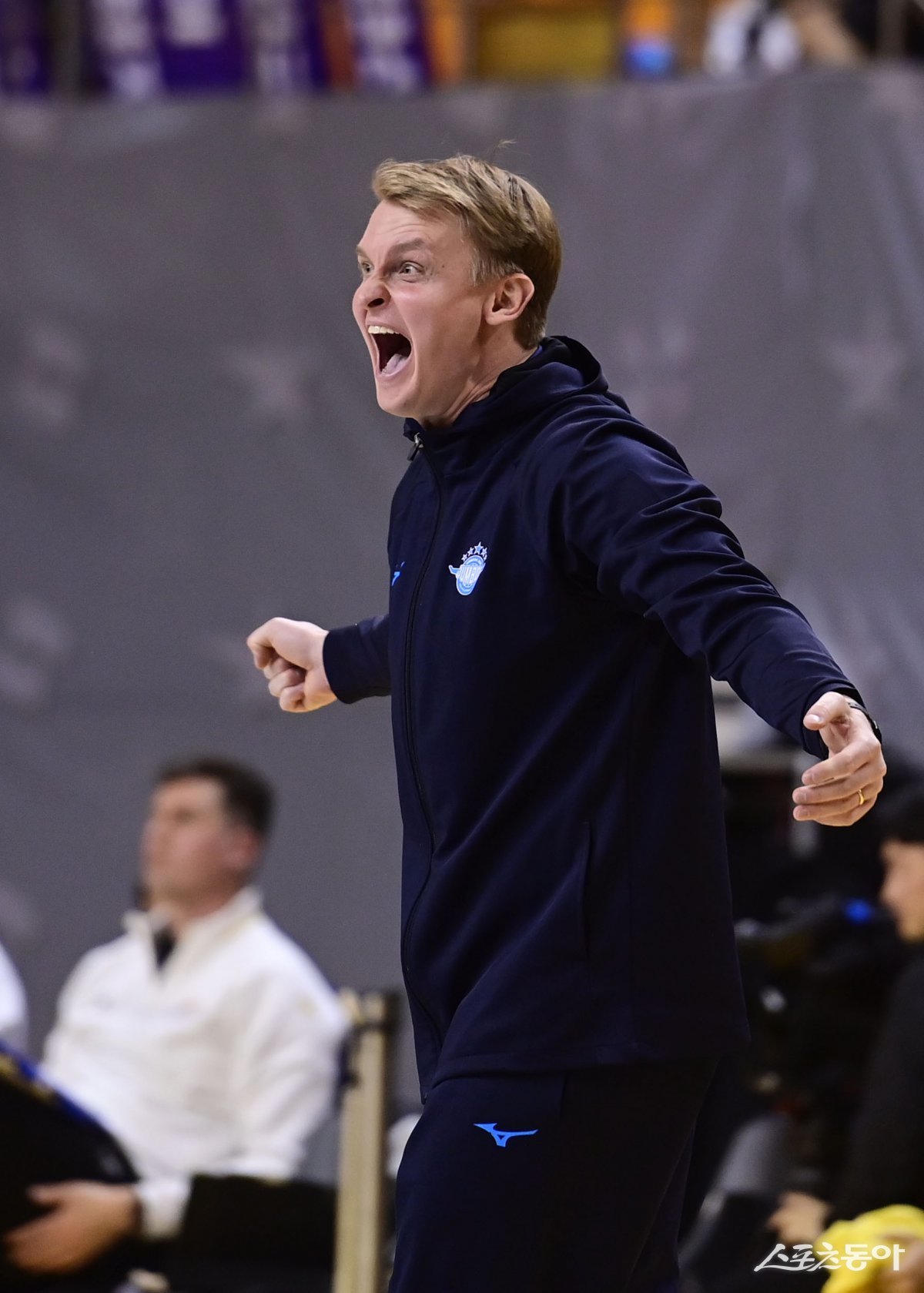 12일 경기 의정부 경민대학교 체육관에서 열린 ‘도드람 2024-2025 V리그’ 남자부 의정부 KB손해보험과 인천 대한항공의 경기에서 팀 득점에 대한항공 틸리카이넨 감독이 포효하고 있다. 의정부 | 주현희 기자 teth1147@donga.com