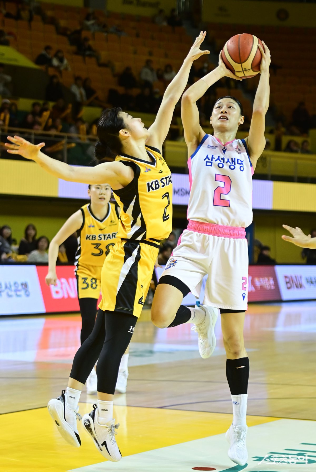 13일 충북 청주체육관에서 열린 ‘하나은행 2024-2025 여자프로농구’ 청주 KB와 용인 삼성생명의 경기에서 삼성생명 이해란이 KB 수비 앞에서 슛을 하고 있다. 청주 | 주현희 기자 teth1147@donga.com