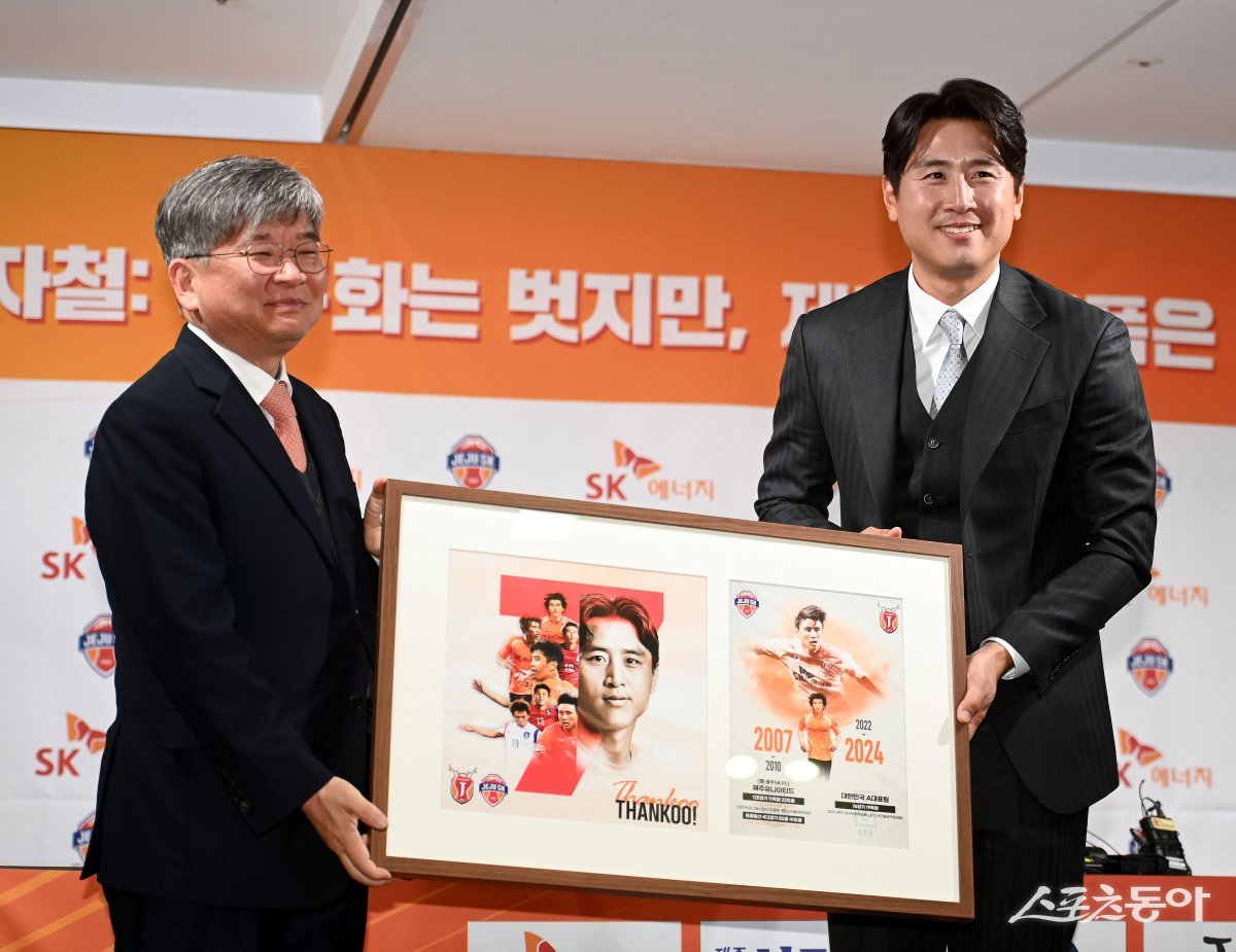 현역 은퇴를 선언한 구자철이 14일 서울 종로구 축구회관에서 제주SK 구창용 대표이사에게 기념액자를 받고 있다. 김종원 기자 won@donga.com