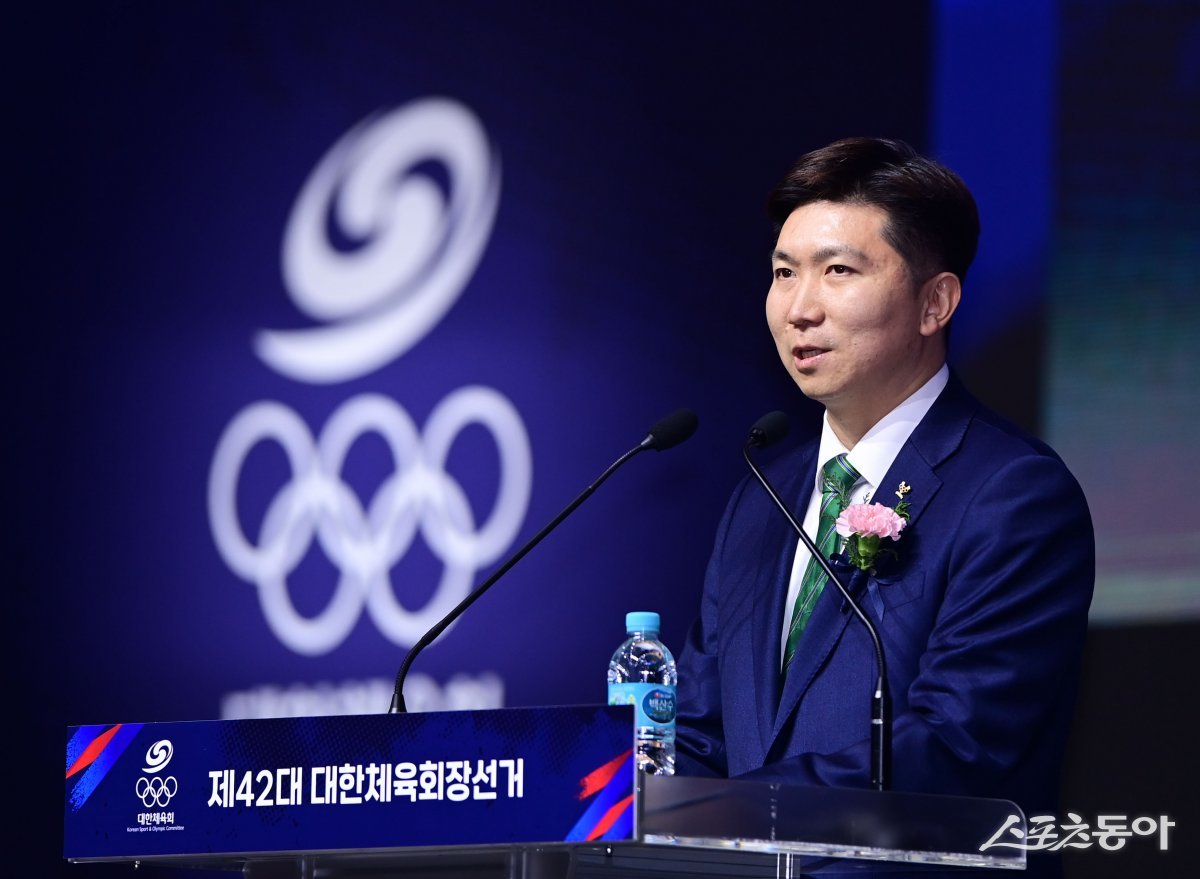 ‘제42대 대한체육회장 선거’가 14일 서울 송파구 올림픽공원 올림픽홀에서 열렸다. 유승민 후보자가 정견 발표를 하고 있다. 주현희 기자 teth1147@donga.com