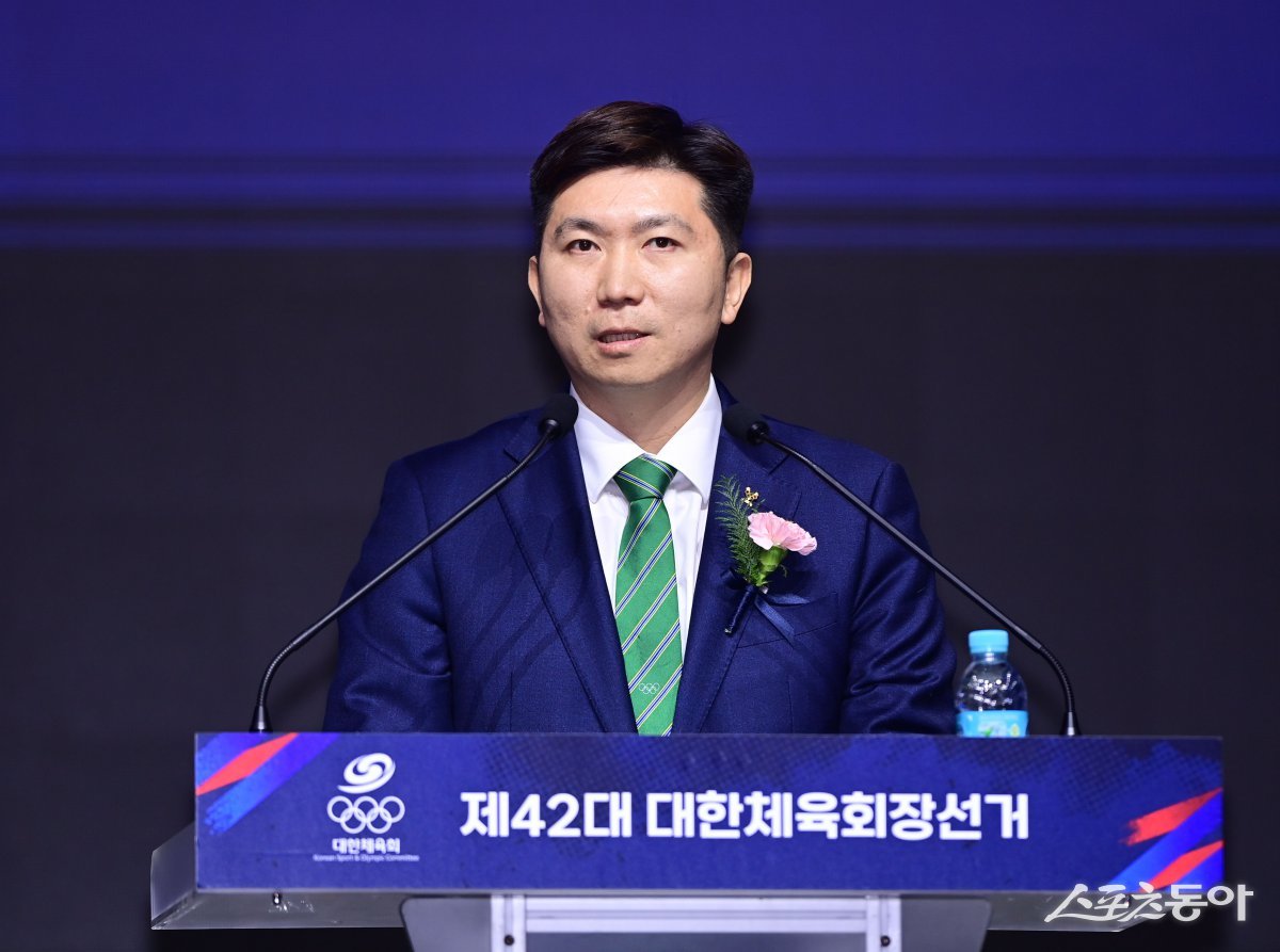 ‘제42대 대한체육회장 선거’가 14일 서울 송파구 올림픽공원 올림픽홀에서 열렸다. 유승민 후보자가 정견 발표를 하고 있다. 주현희 기자 teth1147@donga.com