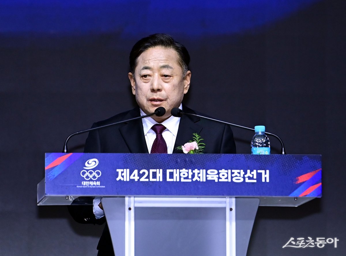 ‘제42대 대한체육회장 선거’가 14일 서울 송파구 올림픽공원 올림픽홀에서 열렸다. 김용주 후보자가 정견 발표를 하고 있다. 주현희 기자 teth1147@donga.com