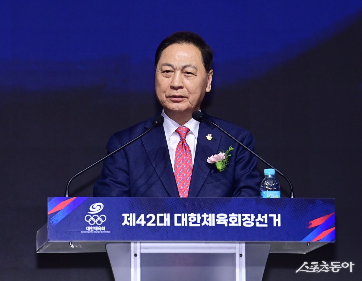 ‘제42대 대한체육회장 선거’가 14일 서울 송파구 올림픽공원 올림픽홀에서 열렸다. 강태선 후보자가 정견 발표를 하고 있다. 주현희 기자 teth1147@donga.com