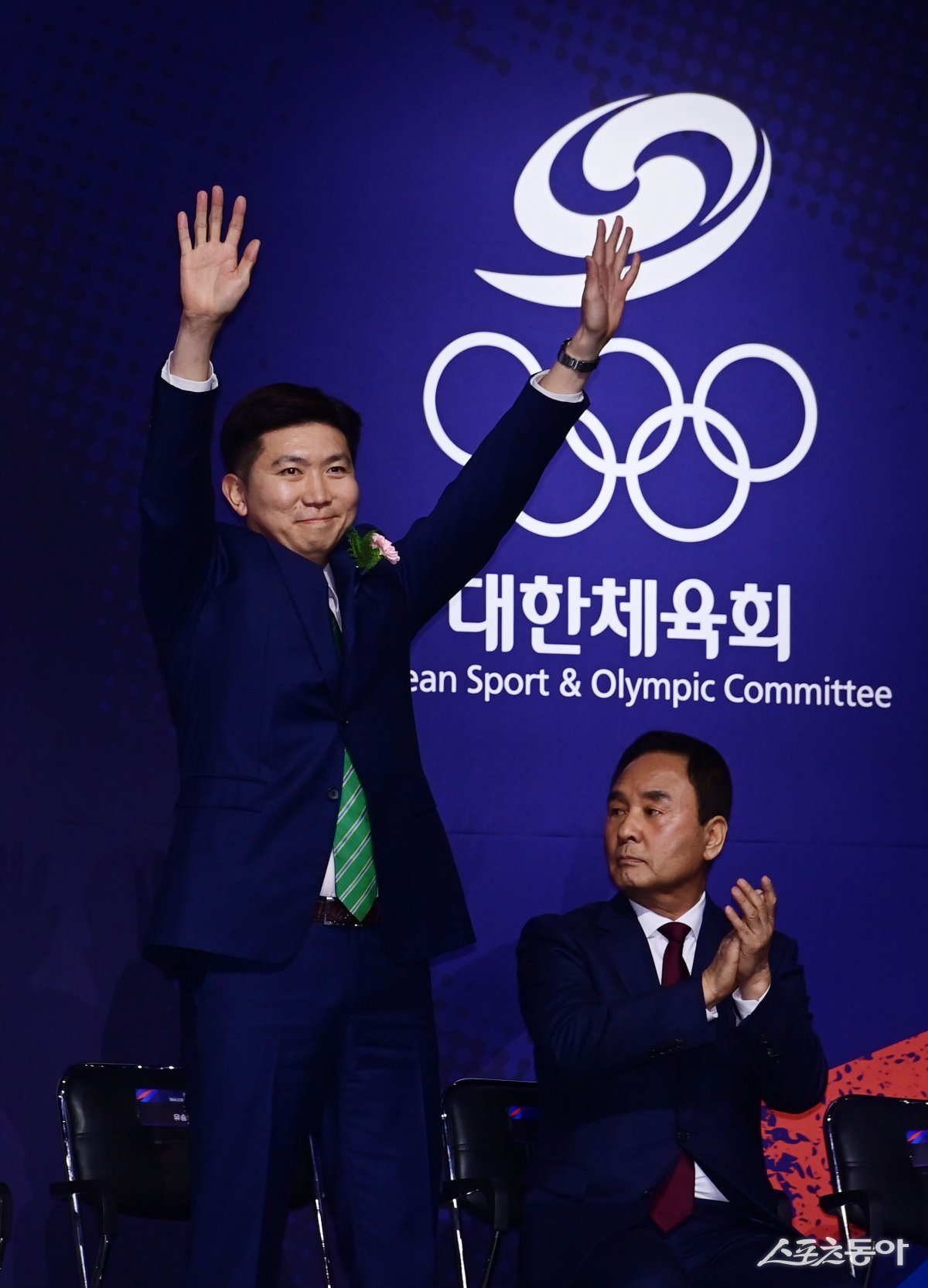 ‘제42대 대한체육회장 선거’가 14일 서울 송파구 올림픽공원 올림픽홀에서 열렸다. 대한체육회장에 당선된 유승민이 기뻐하고 있다. 주현희 기자 teth1147@donga.com