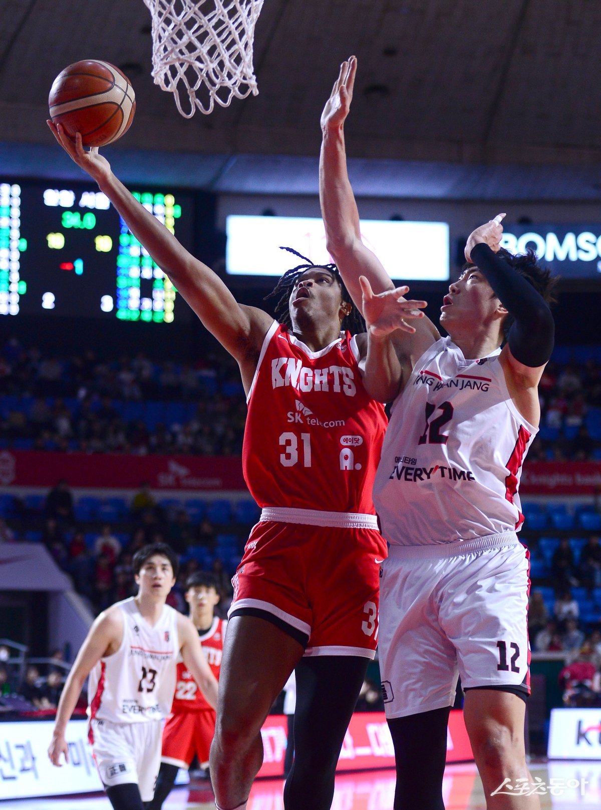 14일 서울 잠실학생체육관에서 열린 ‘2024-2025 프로농구’ SK와 정관장 경기에서 SK 아이재아 힉스가 정관장의 수비를 뚫고 골밑 슛을 하고 있다. 잠실|김종원 기자 won@donga.com
