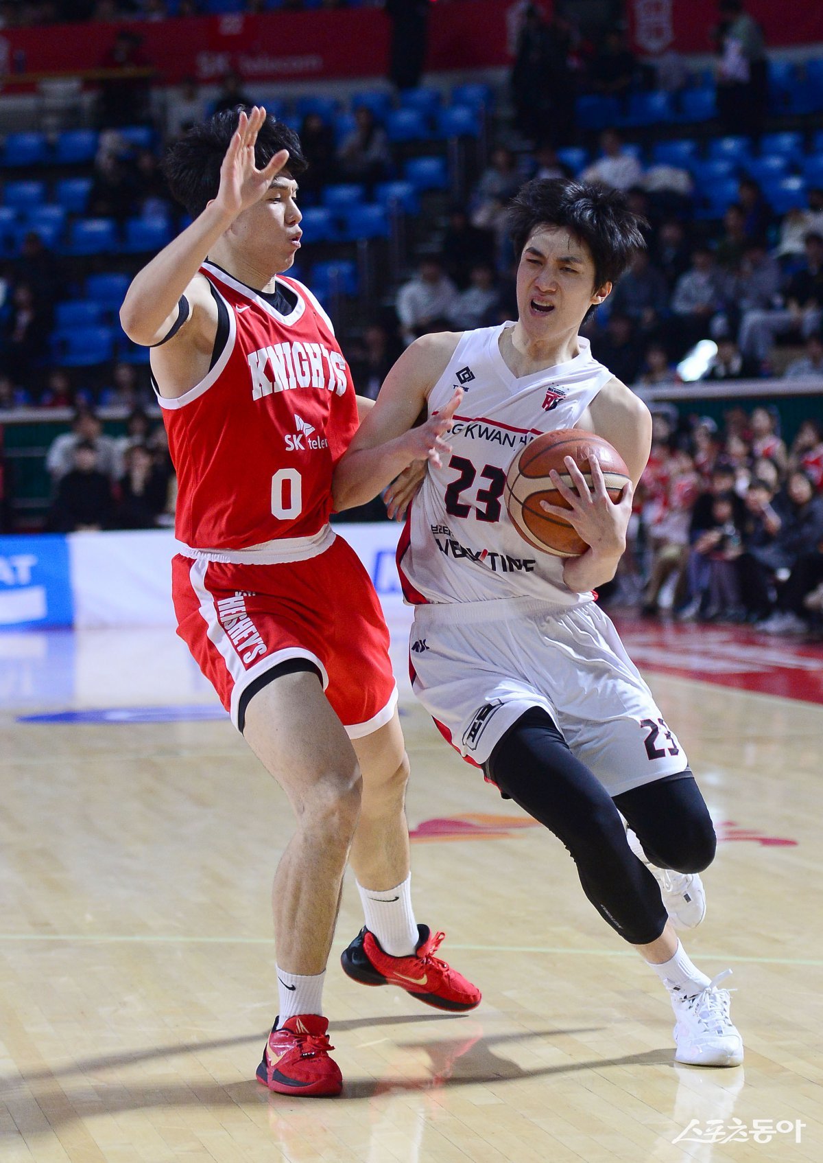 14일 서울 잠실학생체육관에서 열린 ‘2024-2025 프로농구’ SK와 정관장 경기에서 정관장 배병준이 SK의 수비를 뚫고 골밑을 공격하고 있다. 잠실|김종원 기자 won@donga.com