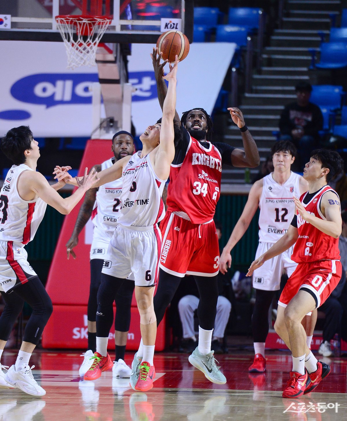 14일 서울 잠실학생체육관에서 열린 ‘2024-2025 프로농구’ SK와 정관장 경기에서 SK 워니와 정관장 박지훈리 리바운드 볼을 다투고 있다. 잠실|김종원 기자 won@donga.com