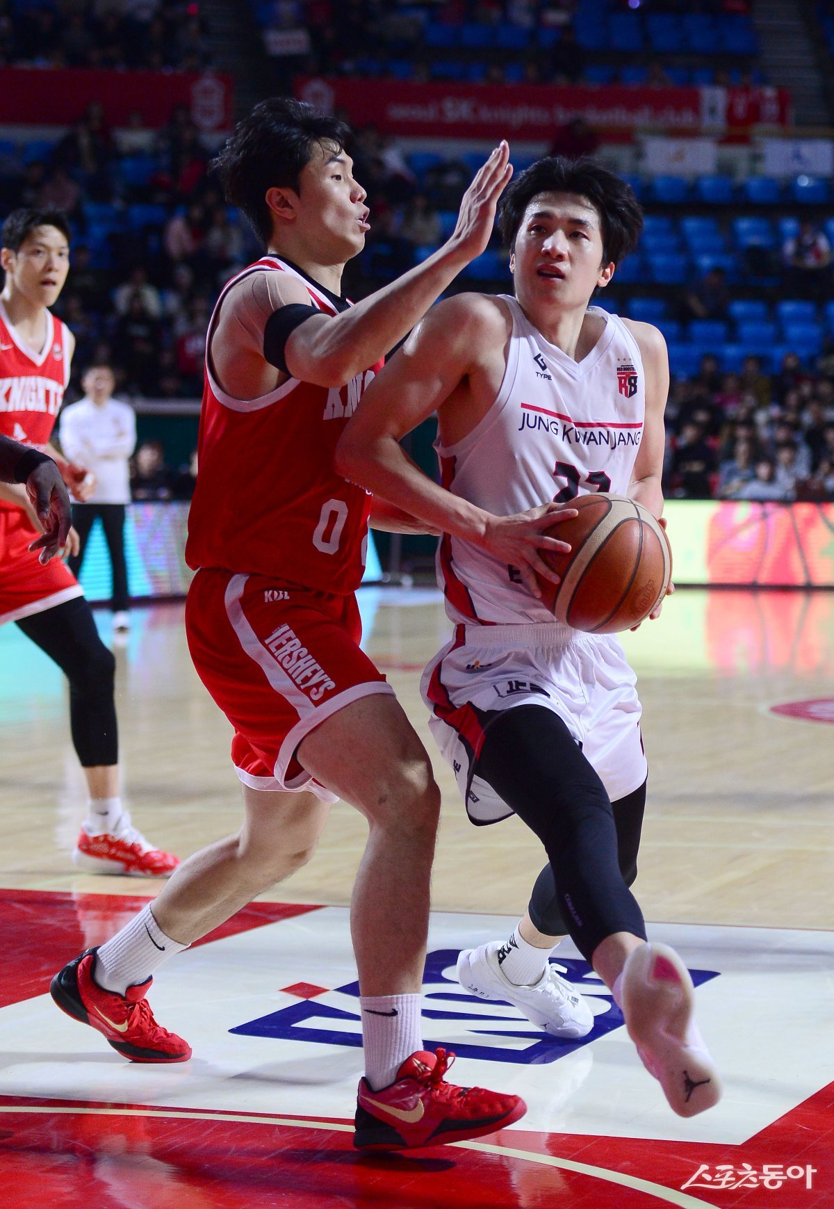 14일 서울 잠실학생체육관에서 열린 ‘2024-2025 프로농구’ SK와 정관장 경기에서 정관장 배병준이 SK의 수비를 뚫고 골밑을 공격하고 있다. 잠실|김종원 기자 won@donga.com