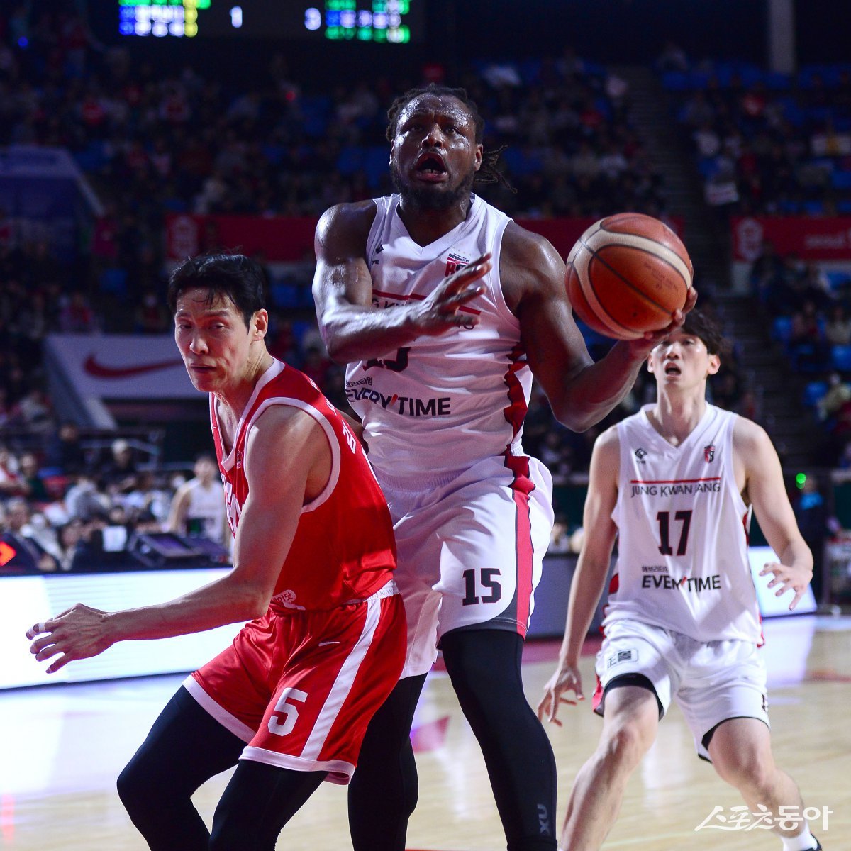 14일 서울 잠실학생체육관에서 열린 ‘2024-2025 프로농구’ SK와 정관장 경기에서 정관장 버튼이 리바운드 볼을 잡고 있다. 잠실|김종원 기자 won@donga.com