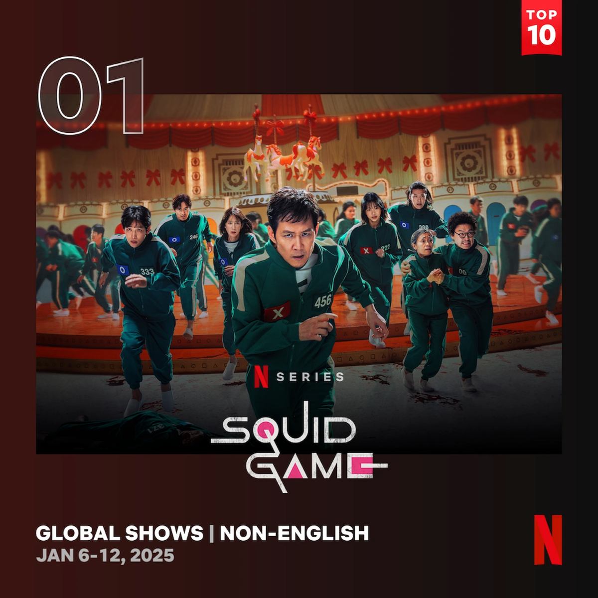 독보적인 프로덕션과 더 다채로워진 캐릭터들의 서사로 전 세계를 사로잡고 있는 ‘오징어 게임’ 시즌2가 1월 6일(월)부터 1월 12일(일)까지 26,300,000 시청수(시청 시간을 작품의 총 러닝 타임으로 나눈 값)를 기록하며 넷플릭스 글로벌 TOP 10 시리즈 부문 영어, 비영어 통합 1위를 유지, 93개국 TOP 10 리스트에서 폭발적인 호응을 이어 나가고 있다.