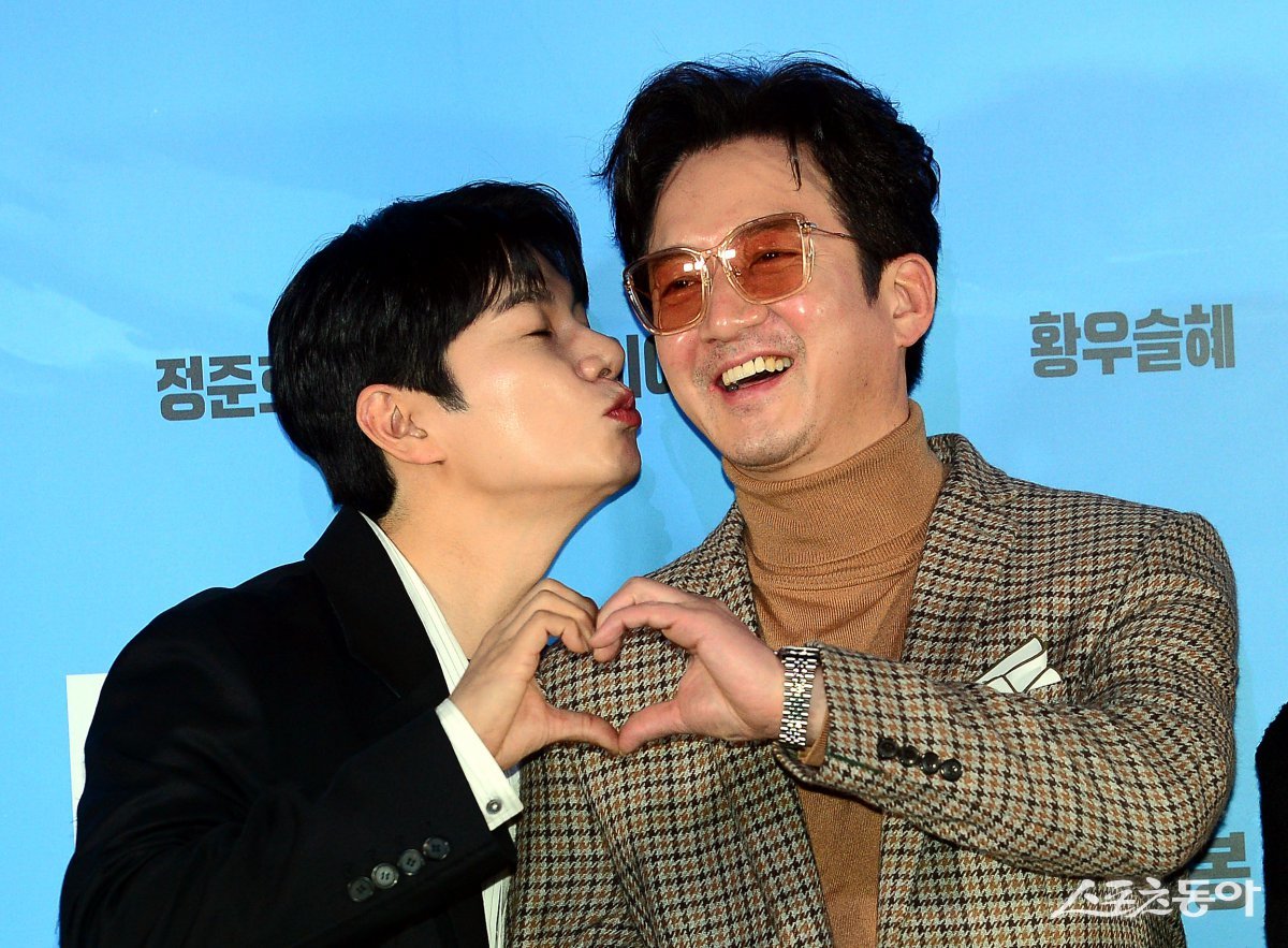 15일 서울 용산구 CGV용산아이파크몰에서 열린 영화 ‘히트맨2’ 언론시사회에 참석한 배우 이이경과 정준호가 카메라를 향해 포즈를 취하고 있다. 김민성 기자 marineboy@donga.com