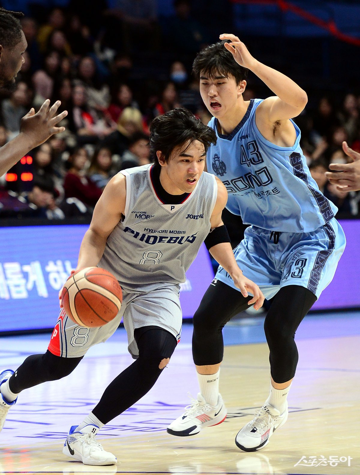 15일 경기도 고양체육관에서 열린 ‘2024-2025 KCC 프로농구’ 고양 소노와 울산 현대모비스의 경기에서 현대모비스 옥존이 소노 정성조의 수비를 피해 돌파를 시도하고 있다. 고양 | 김민성 기자 marineboy@donga.com