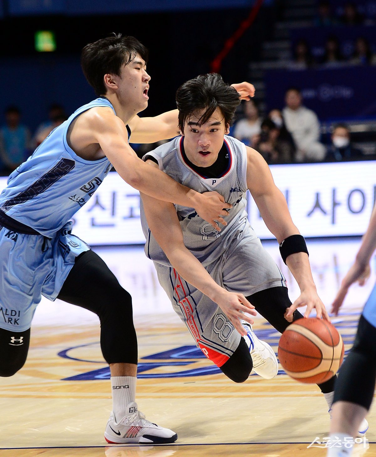 15일 경기도 고양체육관에서 열린 ‘2024-2025 KCC 프로농구’ 고양 소노와 울산 현대모비스의 경기에서 현대모비스 옥존이 소노 정성조의 수비를 피해 돌파를 시도하고 있다. 고양 | 김민성 기자 marineboy@donga.com