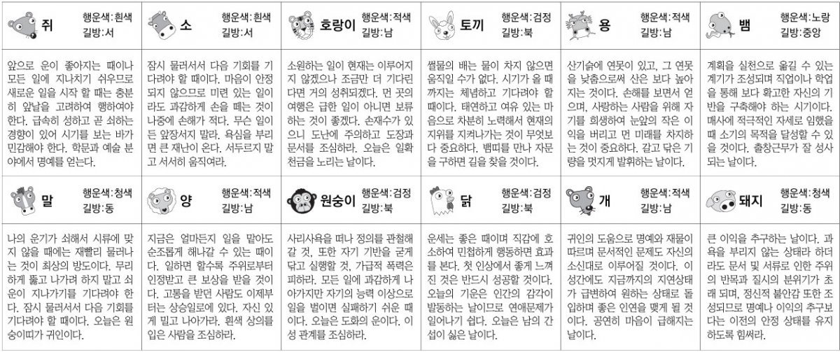 쥐띠 : 앞으로운이좋아지는때이나모든일에지나치기쉬우므로새로운일을시작할때는충분히앞날을고려하여행하여야한다.급속히성하고곧쇠하는경향이있어시기를보는바가민감해야한다.학문과예술분야에서명예를얻는다.