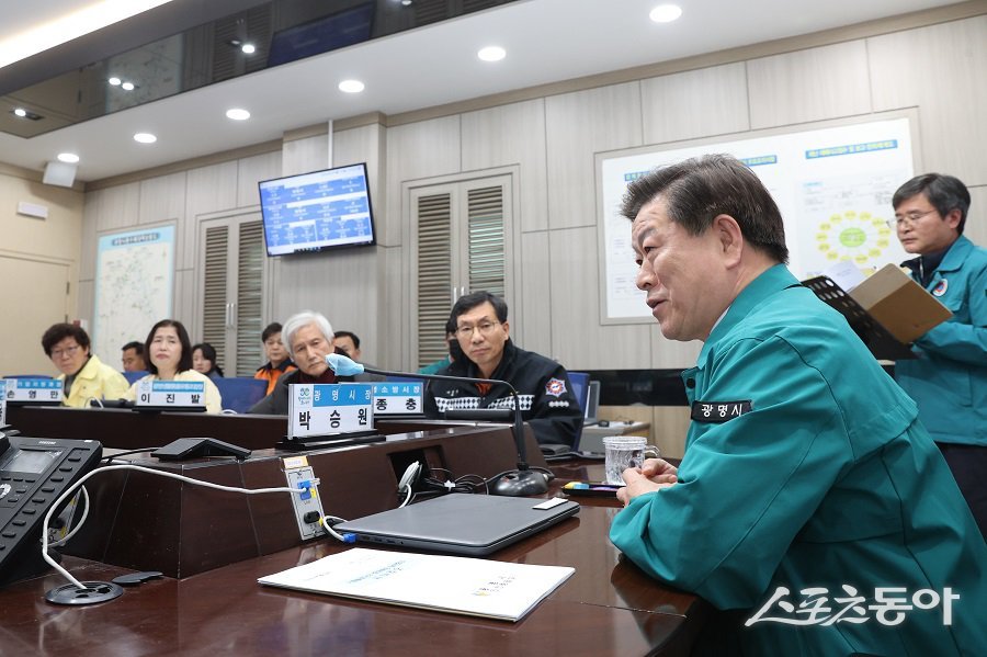 박승원 광명시장이 지난 15일 오후 시청 재난상황실에서 열린 ‘사들물류단지 화재 예방 대책 회의‘에 참석해 회의를 진행하고 있다. 사진제공|광명시청