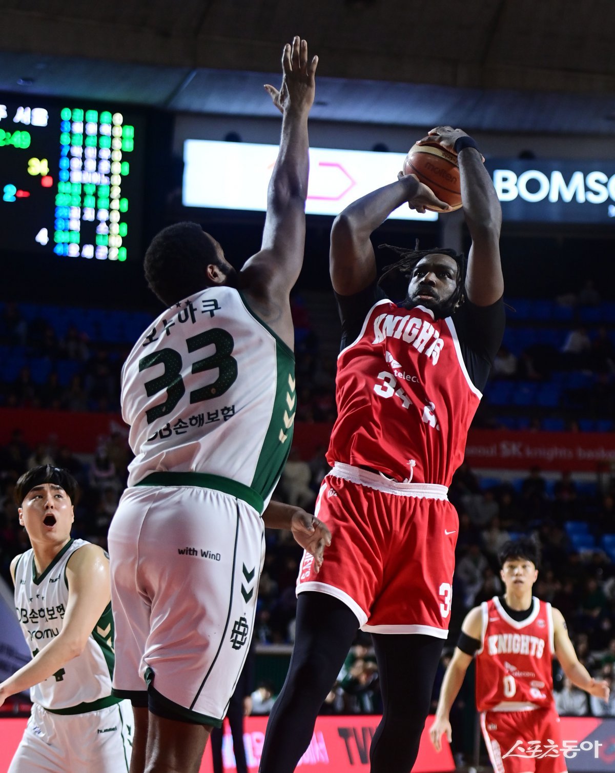 16일 서울 잠실학생체육관에서 열린 ‘2024-2025 KCC 프로농구’ 서울 SK과 원주 DB의 경기에서 SK 워니가 DB 수비 앞에서 슛을 하고 있다. 잠실 | 주현희 기자 teth1147@donga.com