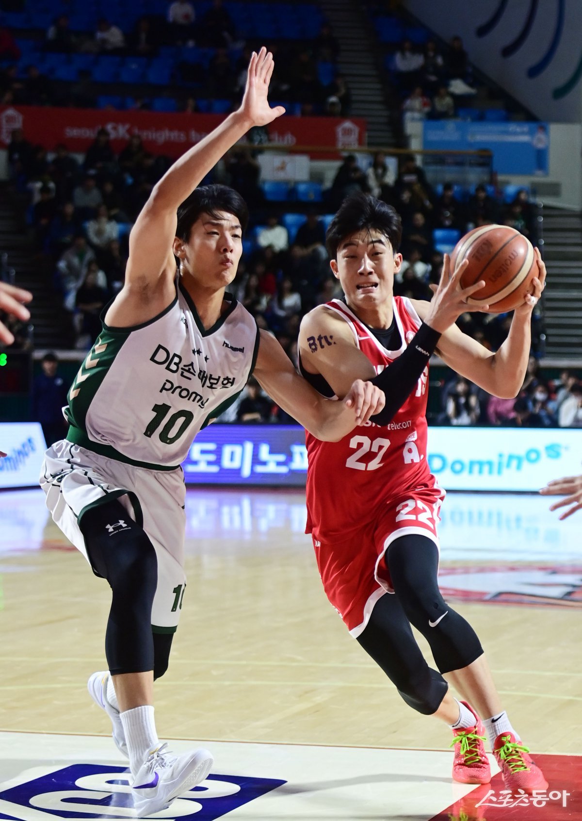 16일 서울 잠실학생체육관에서 열린 ‘2024-2025 KCC 프로농구’ 서울 SK과 원주 DB의 경기에서 SK 오재현이 DB 김보배의 수비를 뚫고 드리블 돌파를 하고 있다. 잠실 | 주현희 기자 teth1147@donga.com