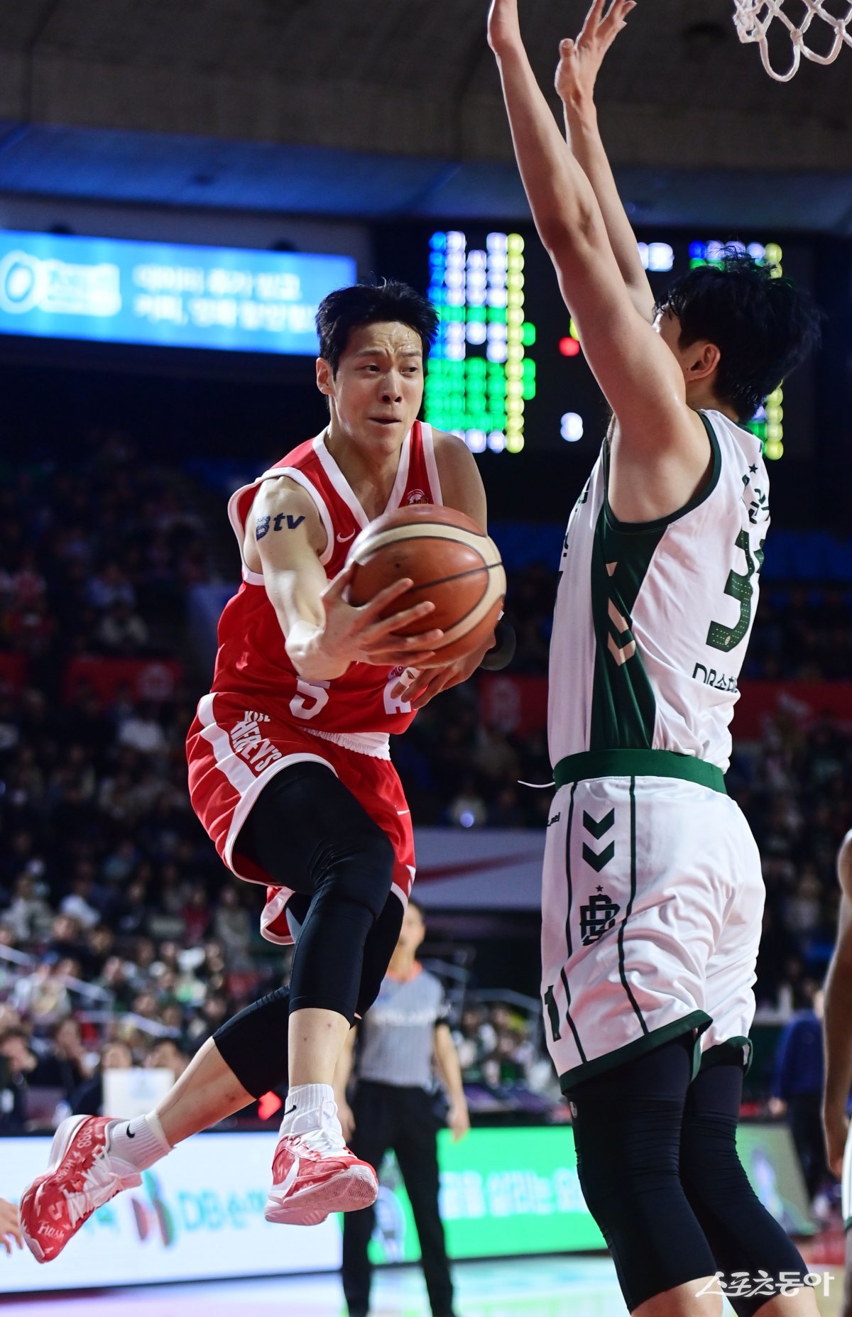 16일 서울 잠실학생체육관에서 열린 ‘2024-2025 KCC 프로농구’ 서울 SK과 원주 DB의 경기에서 SK 김선형이 DB 수비 앞에서 동료에게 패스하고 있다. 잠실 | 주현희 기자 teth1147@donga.com