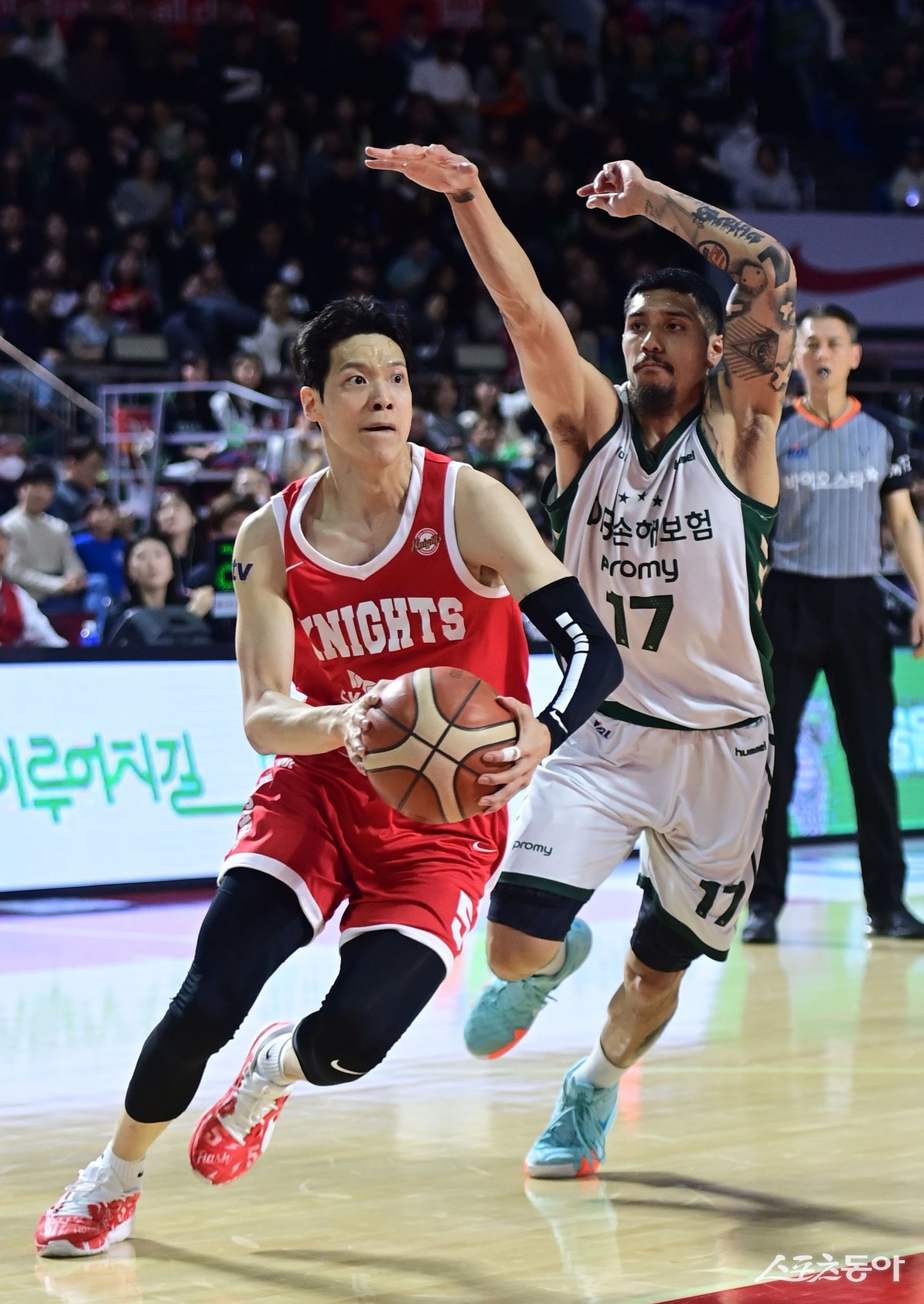 16일 서울 잠실학생체육관에서 열린 ‘2024-2025 KCC 프로농구’ 서울 SK과 원주 DB의 경기에서 SK 김선형이 DB 알바노의 수비를 뚫고 드리블 돌파를 하고 있다. 잠실 | 주현희 기자 teth1147@donga.com