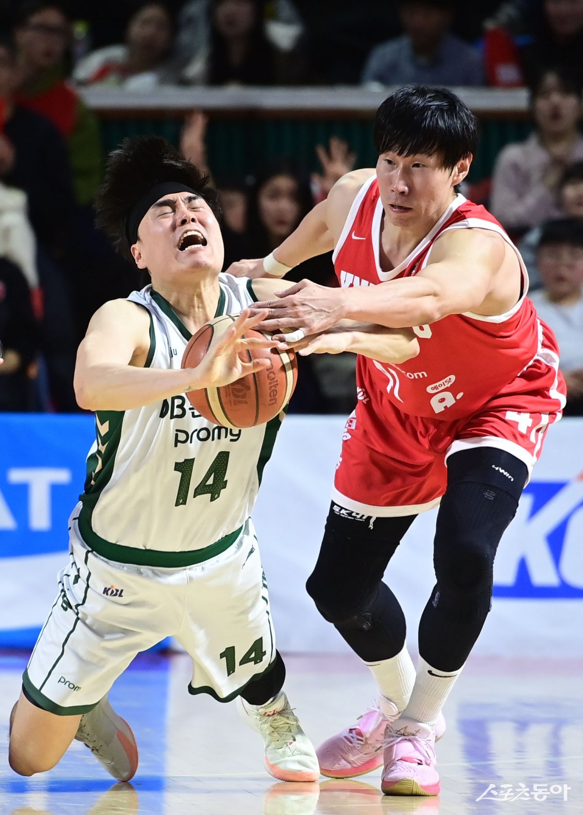 16일 서울 잠실학생체육관에서 열린 ‘2024-2025 KCC 프로농구’ 서울 SK과 원주 DB의 경기에서 DB 김훈이 SK 오세근에게 볼을 빼앗기고 있다. 잠실 | 주현희 기자 teth1147@donga.com