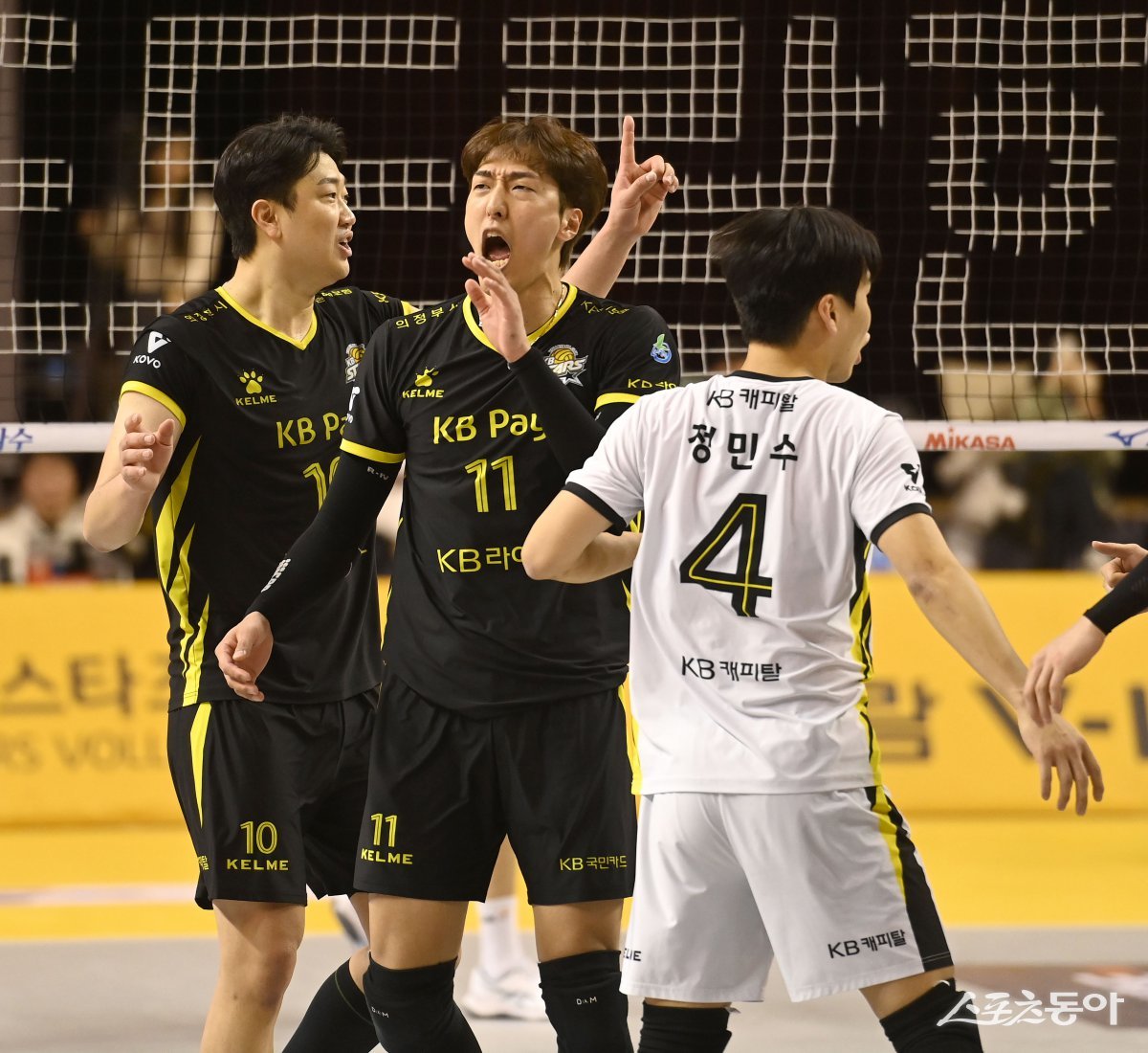 16일 의정부 경민대체육관에서 열린 ‘도드람 2024~2025 V-리그’ 남자부 KB손해보험과 OK저축은행 경기에서 KB손해보험 차영석이 득점에 성공한 후 기뻐하고 있다. 의정부 | 김종원 기자 won@donga.com