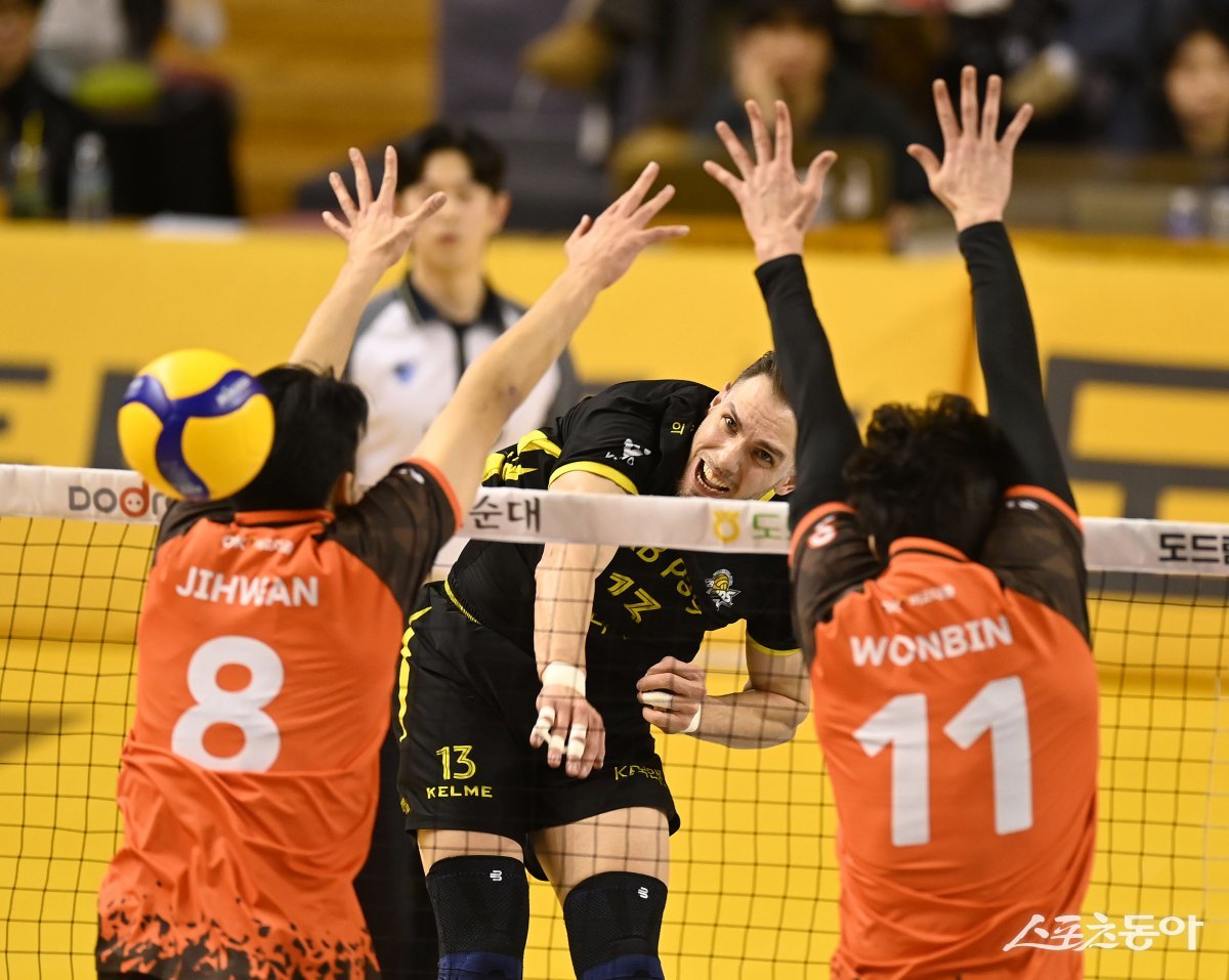 16일 의정부 경민대체육관에서 열린 ‘도드람 2024~2025 V-리그’ 남자부 KB손해보험과 OK저축은행 경기에서 KB손해보험 비예나가 OK저축은행 블로킹 사이로 스파이크를 날리고 있다. 의정부 | 김종원 기자 won@donga.com