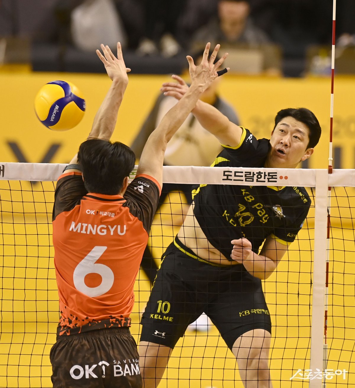 16일 의정부 경민대체육관에서 열린 ‘도드람 2024~2025 V-리그’ 남자부 KB손해보험과 OK저축은행 경기에서 KB손해보험 나경복이 OK저축은행 블로킹 사이로 스파이크를 날리고 있다. 의정부 | 김종원 기자 won@donga.com
