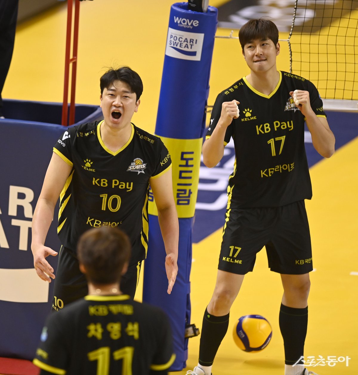 16일 의정부 경민대체육관에서 열린 ‘도드람 2024~2025 V-리그’ 남자부 KB손해보험과 OK저축은행 경기에서 KB손해보험 나경복이 득점에 성공한 후 기뻐하고 있다. 의정부 | 김종원 기자 won@donga.com