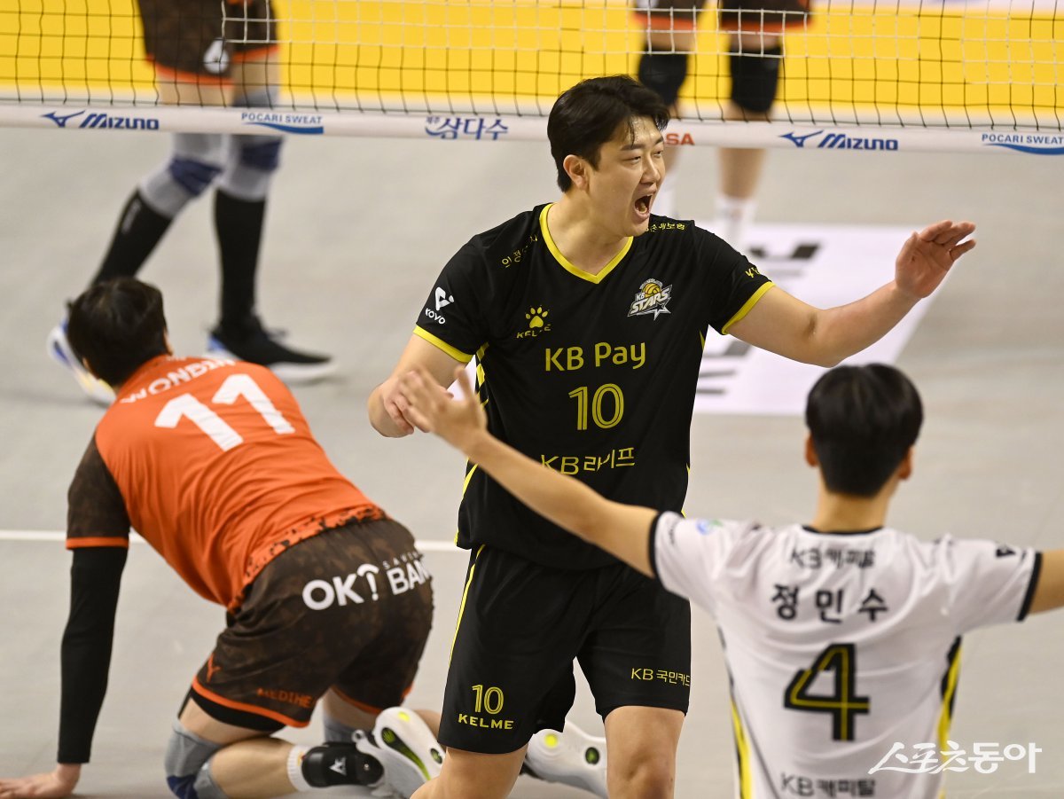 16일 의정부 경민대체육관에서 열린 ‘도드람 2024~2025 V-리그’ 남자부 KB손해보험과 OK저축은행 경기에서 KB손해보험 나경복이 득점에 성공한 후 기뻐하고 있다. 의정부 | 김종원 기자 won@donga.com