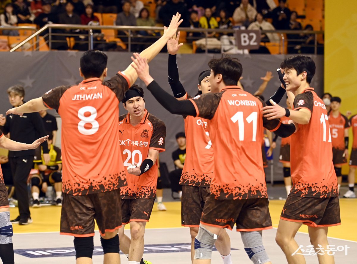 16일 의정부 경민대체육관에서 열린 ‘도드람 2024~2025 V-리그’ 남자부 KB손해보험과 OK저축은행 경기에서 OK저축은행 신호진이 득점에 성공한 후 기뻐하고 있다. 의정부 | 김종원 기자 won@donga.com