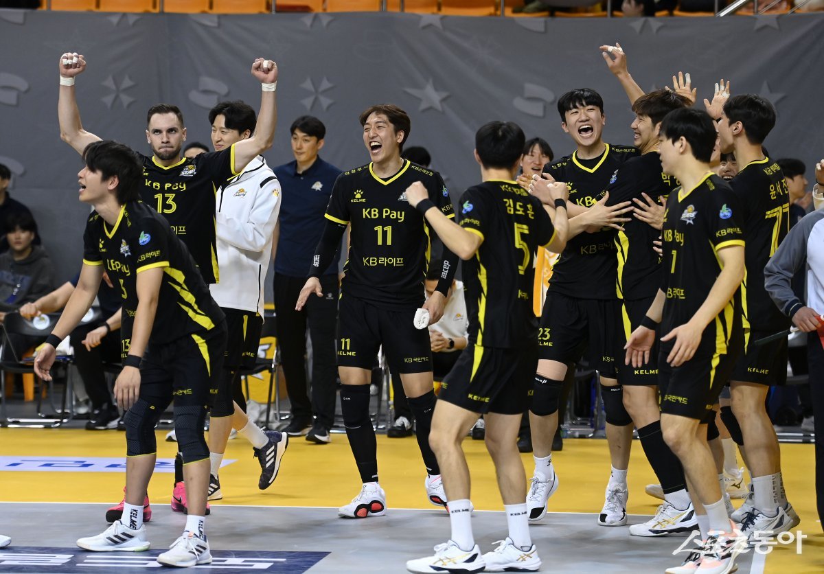 16일 의정부 경민대체육관에서 열린 ‘도드람 2024~2025 V-리그’ 남자부 KB손해보험과 OK저축은행 경기에서 세트스코어 3-2 승리를 거두며 7연승을 달린 KB손해보험 선수들이 기뻐하고 있다. 의정부 | 김종원 기자 won@donga.com