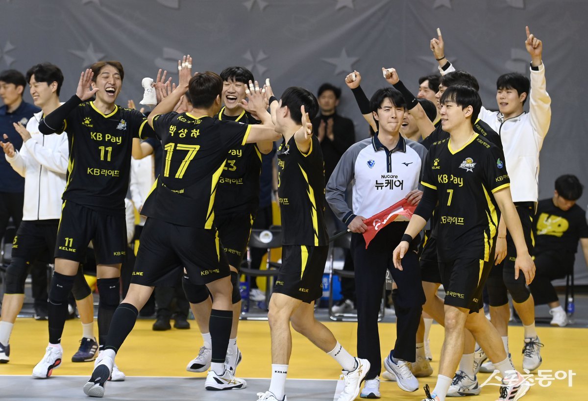 16일 의정부 경민대체육관에서 열린 ‘도드람 2024~2025 V-리그’ 남자부 KB손해보험과 OK저축은행 경기에서 세트스코어 3-2 승리를 거두며 7연승을 달린 KB손해보험 선수들이 기뻐하고 있다. 의정부 | 김종원 기자 won@donga.com