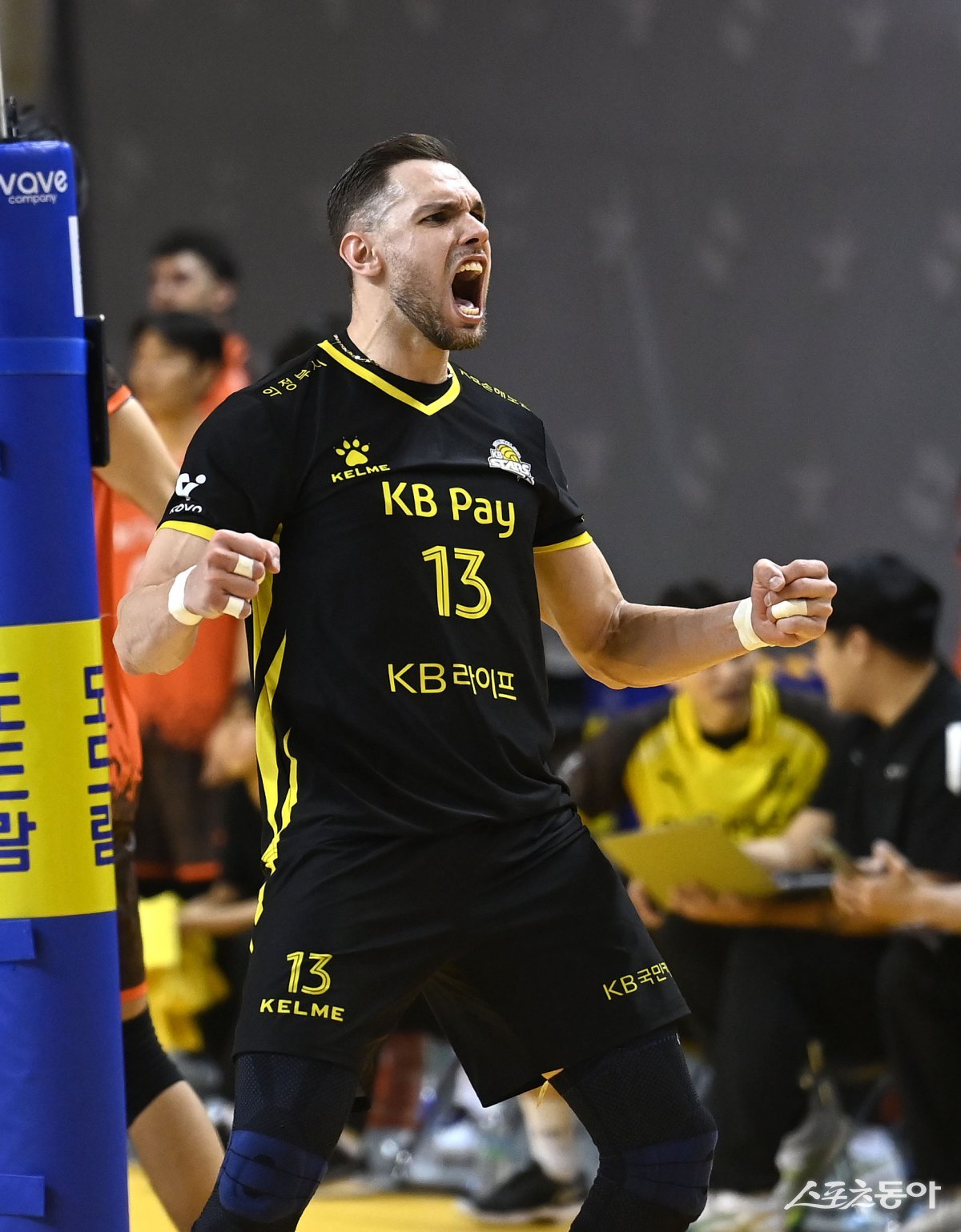 16일 의정부 경민대체육관에서 열린 ‘도드람 2024~2025 V-리그’ 남자부 KB손해보험과 OK저축은행 경기에서 KB손해보험 비예나가 득점에 성공한 후 기뻐하고 있다. 의정부 | 김종원 기자 won@donga.com