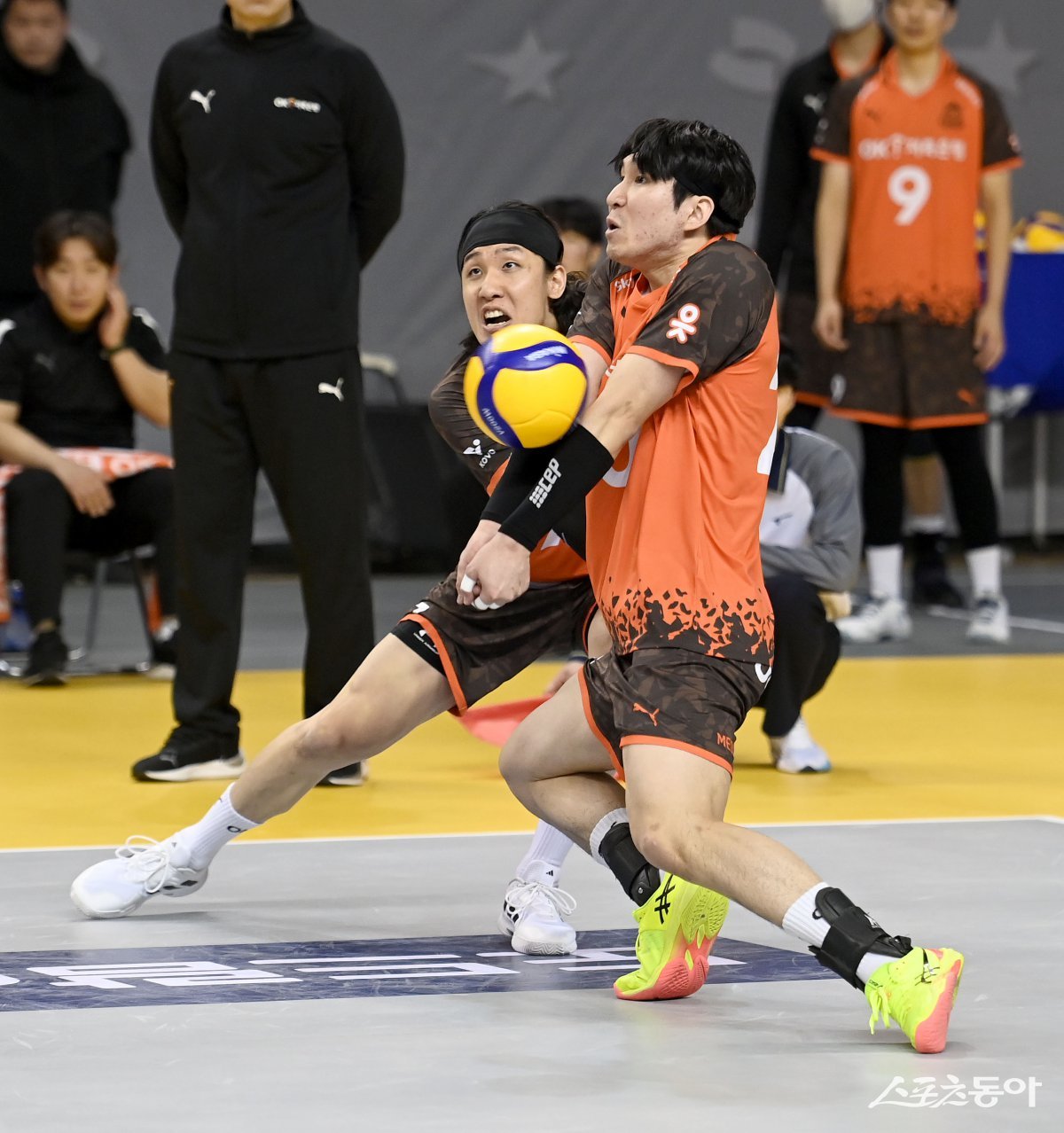 16일 의정부 경민대체육관에서 열린 ‘도드람 2024~2025 V-리그’ 남자부 KB손해보험과 OK저축은행 경기에서 OK저축은행 신장호와 신호진이 리시브를 하고 있다. 의정부 | 김종원 기자 won@donga.com