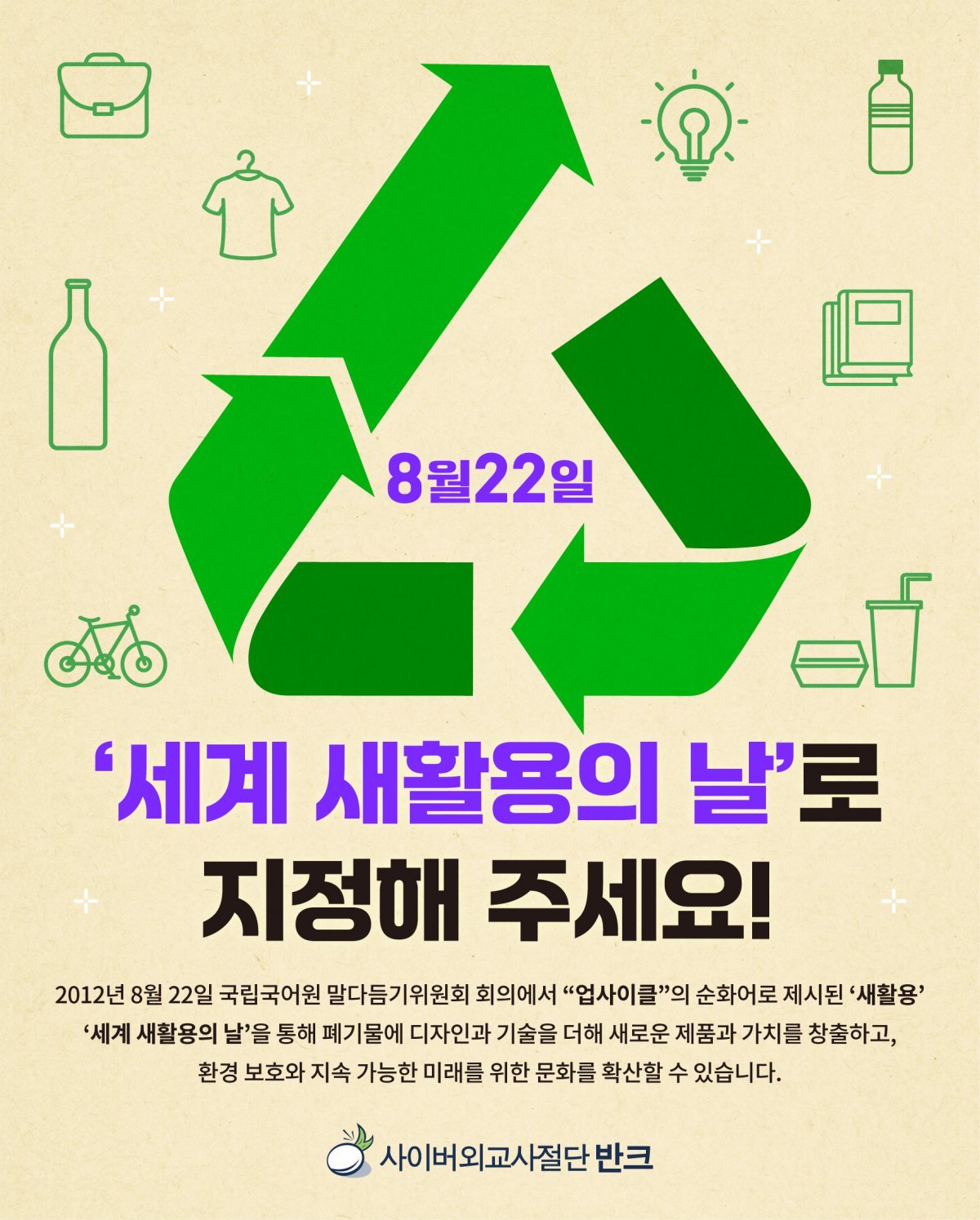 사이버외교사절단 반크가 ‘세계 새활용의 날’(8월 22일) 법정기념일 지정을 위한 캠페인에 나섰다.