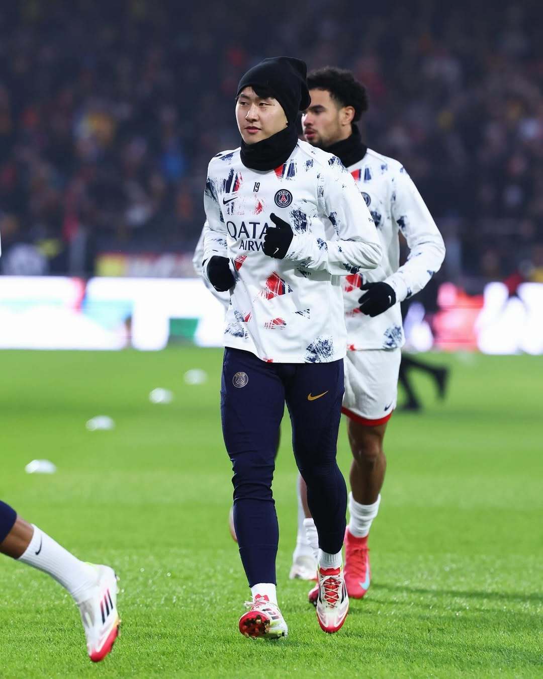 PSG 이강인(앞)이 19일(한국시간) 볼라르트 들르리스 경기장에서 열린 랑스와 리그앙 18라운드 원정경기를 앞두고 몸을 풀고 있다. 사진출처|PSG SNS